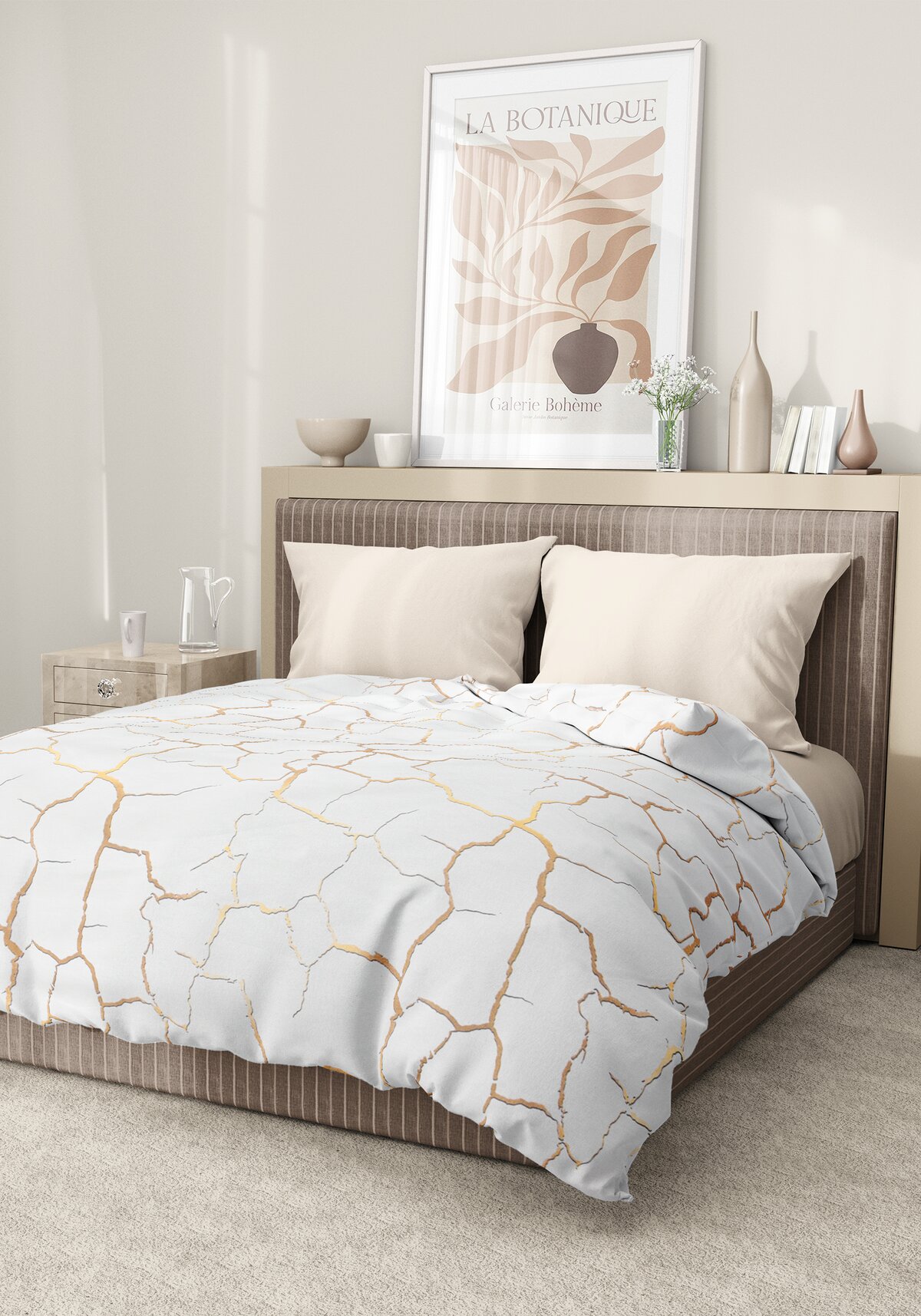 Пододеяльник с золотистым кракелюром выглядит изысканно и благородно. Изделие выполнено из бязи (100%-ый хлопок) - гладкий и ровный материал. Натуральные компоненты текстиля делают полотно гипоаллергенным и экологичным. Пододеяльник из хлопка не скользит, не накапливает статическое электричество, натуральный хлопок абсолютно безопасен для аллергиков и людей с чувствительной кожей.