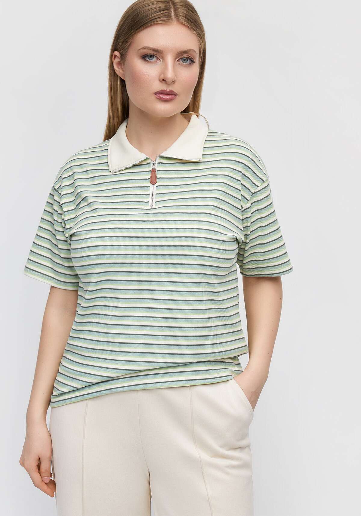 Поло в полоску из хлопка с добавлением спандекса обеспечит комфорт в течение всего дня — ткань приятна к телу и хорошо держит форму. Модель с коротким рукавом и отложным воротником на молнии смотрится стильно и легко вписывается в разные образы. Универсальный дизайн поможет создать непринуждённый летний лук.