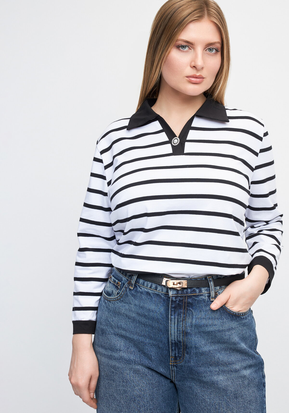 Поло в полоску с декоративной пуговицей — это современная интерпретация классики. Модель выполнена из мягкого хлопкового трикотажа с добавлением спандекса, что придаёт изделию лёгкую эластичность и устойчивость к деформации. Длинный рукав и аккуратный воротник-поло делают образ сдержанным, но выразительным. Декоративная пуговица на планке подчёркивает внимание к деталям и добавляет изюминку. Идеально подходит как для повседневной носки, так и для создания спортивно-элегантных ансамблей.
