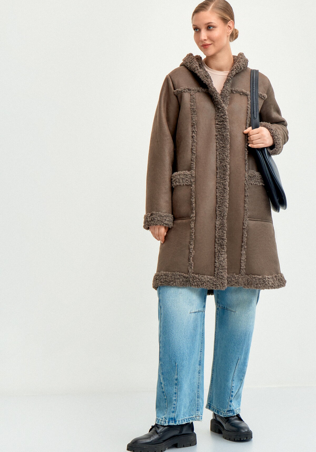 Полупальто полуприлегающего силуэта. Длина до середины колена. Застежка однобортная на кнопки. Глубокий капюшон. Спинка с центральным швом, полочка с кокеткой и рельефами. Впереди функциональные накладные карманы в рельефах. Основа модели искусственная замша, внутренняя часть искусственный мех. Температура комфорта от -10 до -20 градусов.