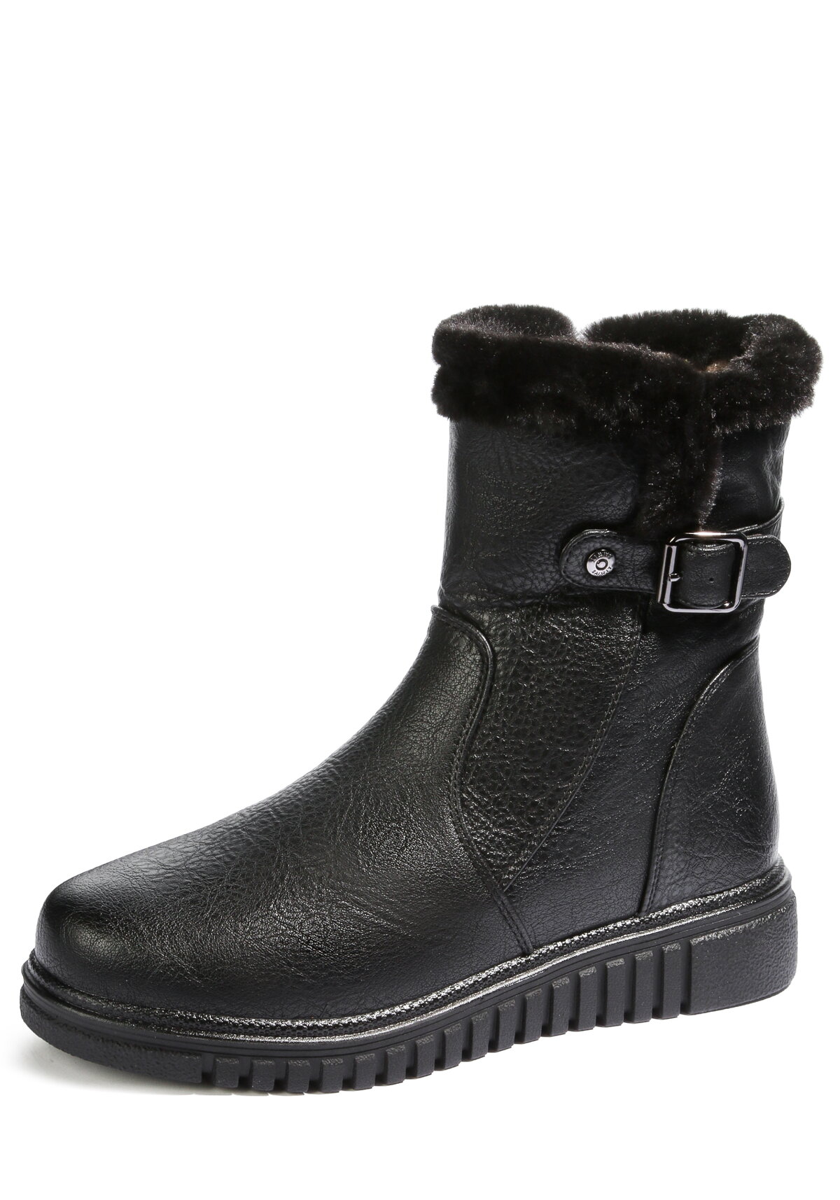 Полусапоги сочетают в себе практичность и стиль. Подкладка из искусственного меха поддерживает комфортную температуру женской ноги на протяжении всего пребывания в обуви. Опушка по верху голенища и декоративная пряжка сбоку. Застегивается на молнию.