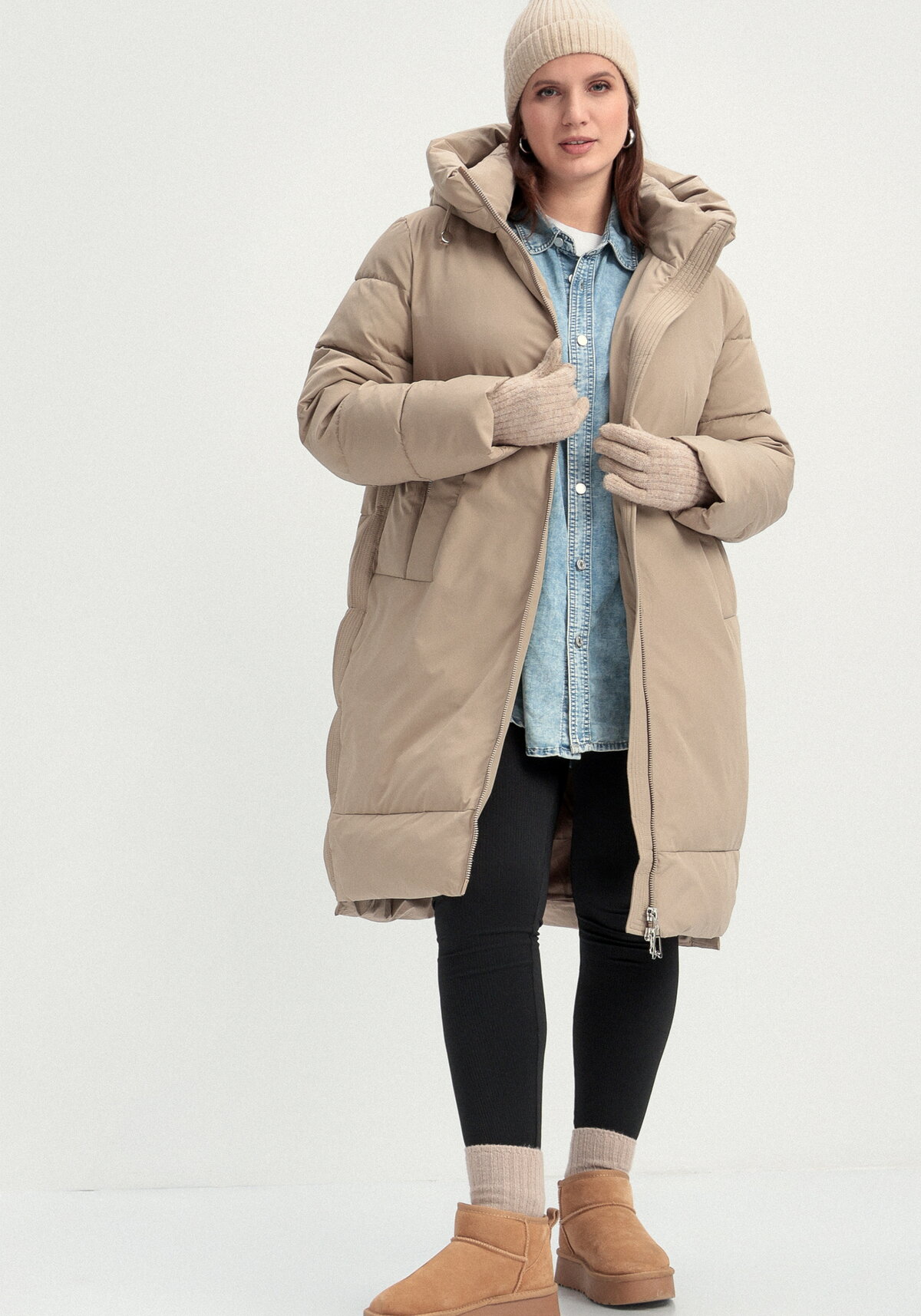 Стильный зимний пуховик длины миди подойдет для фигуры любого типа, в том числе sizeplus. Манжеты на эластичной резинке.