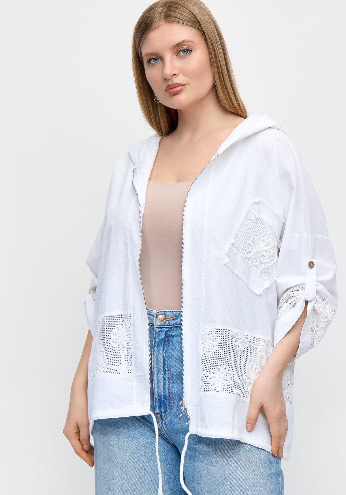 Стильный пыльник с капюшоном и регулируемыми рукавами 7/8 подчеркнёт ваш неповторимый образ — продуманные детали вроде стильной застёжки и завязок по низу создают идеальный силуэт. Эффектная ткань с эффектом варки дополнена изысканной отделкой: декоративная сеточка с вышивкой украшает всё изделие — от рукавов до нагрудного кармана.