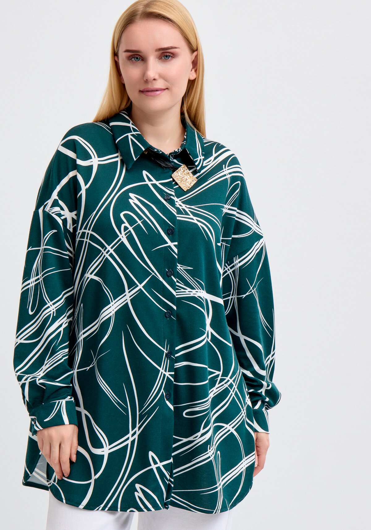 Рубашка свободного кроя с принтом. Имеет отложной воротник и длинный рукав. Застегивается на пуговицы. Модель представлена в трех цветах: черный, изумрудный, коричневый.