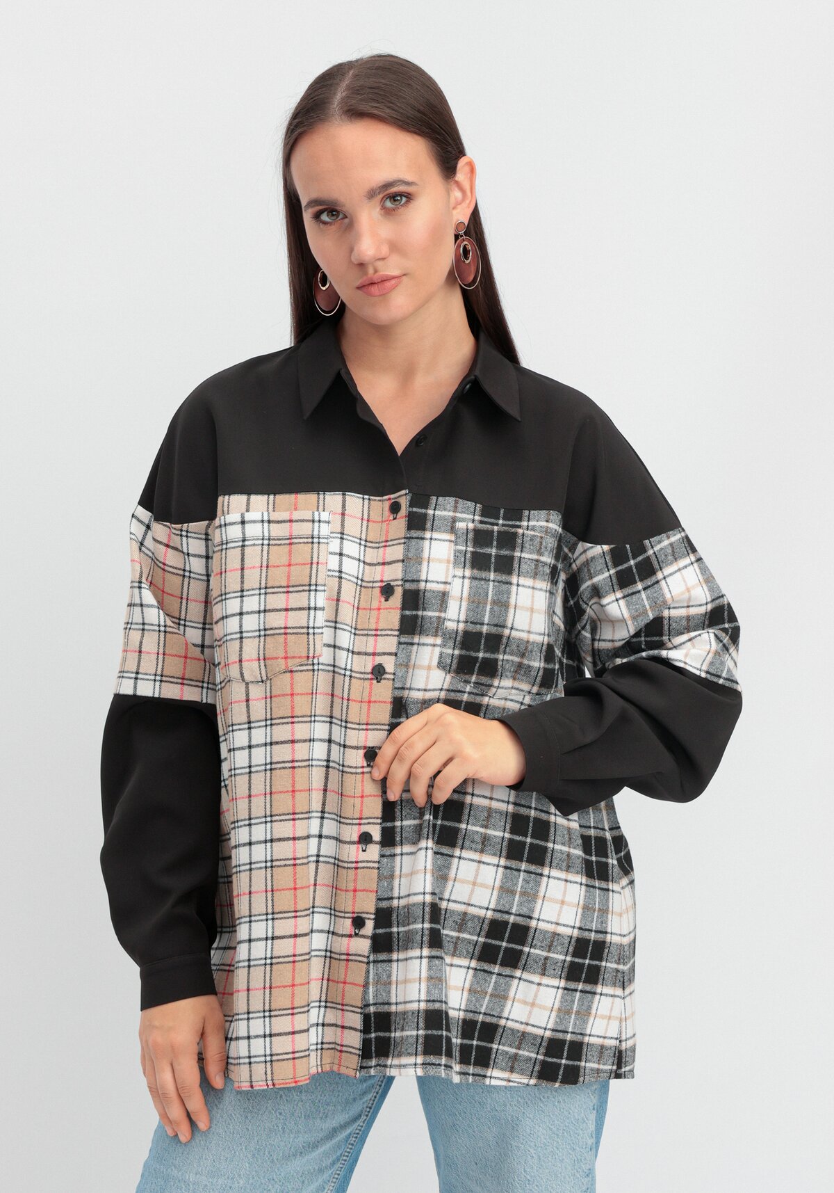 Удлиненная комбинированная рубашка свободного кроя. Рукав на манжете. Накладные карманы. Стильная рубашка подойдет для городской прогулки, похода в кафе и на мероприятие, офиса без строгого дресс-кода.