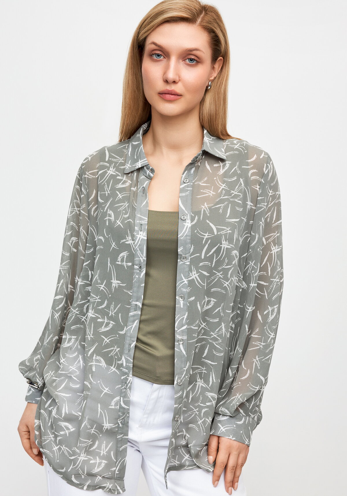 Рубашка выполнена из шифона, имеет классический крой и застежку на пуговицах. Модель дополнена объемным рукавом «фонарик». Материал меньше мнется, хорошо сохраняет внешний вид и подходит для ежедневной носки.