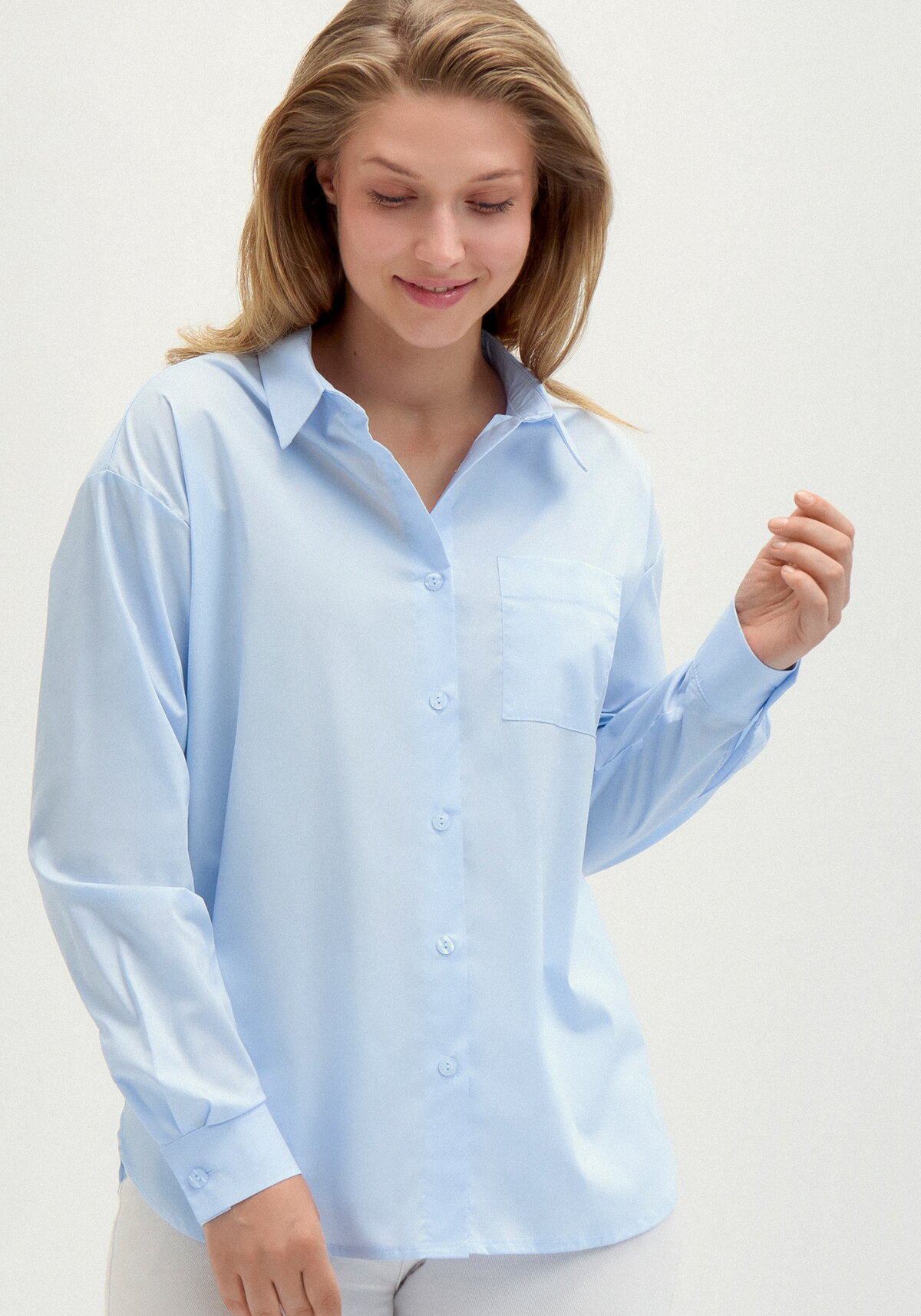 Рубашка свободного кроя оверсайз. Плечо спущенное, рукава рубашечные с манжетами. По спинке кокетка и встречная складка. Застёжка однобортная, воротник отложной на стойке. Впереди накладной карман. Модель представлена в трех цветах: белый, голубой, марсала.