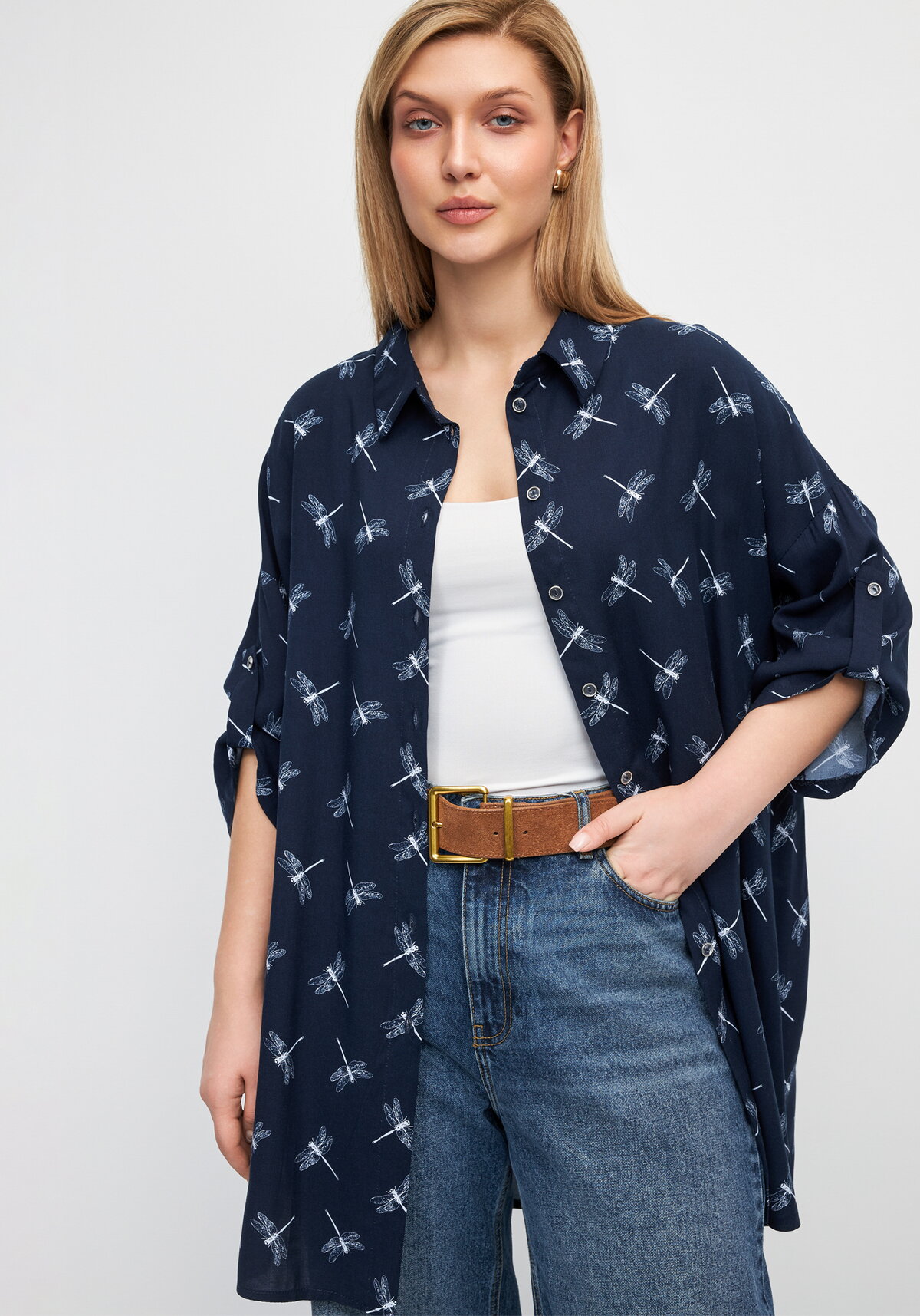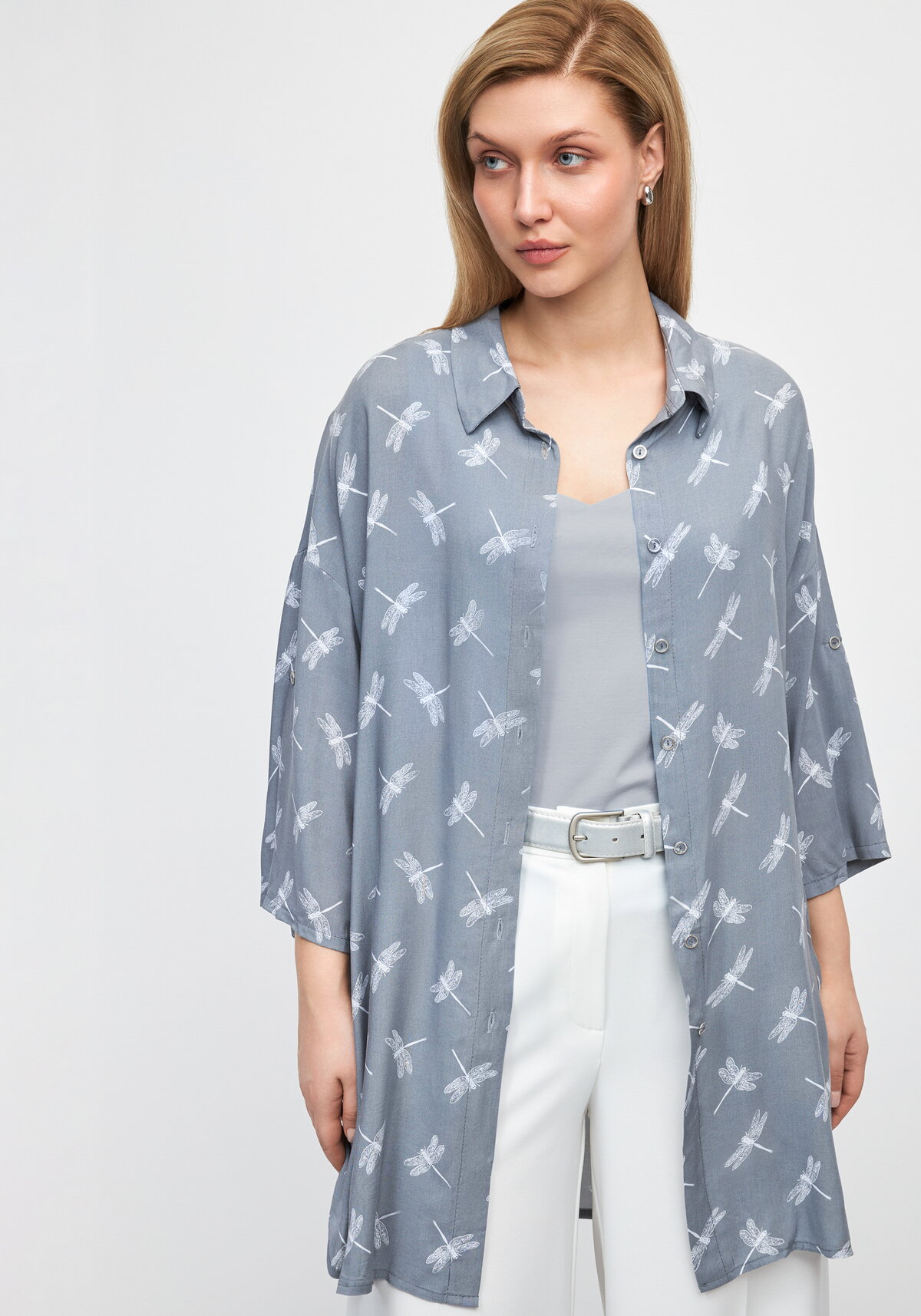 Рубашка удлиненного кроя формирует выразительный силуэт. Застежка на пуговицы по всей длине изделия. Стильный дизайн дает широкие возможности для составления различных образов.