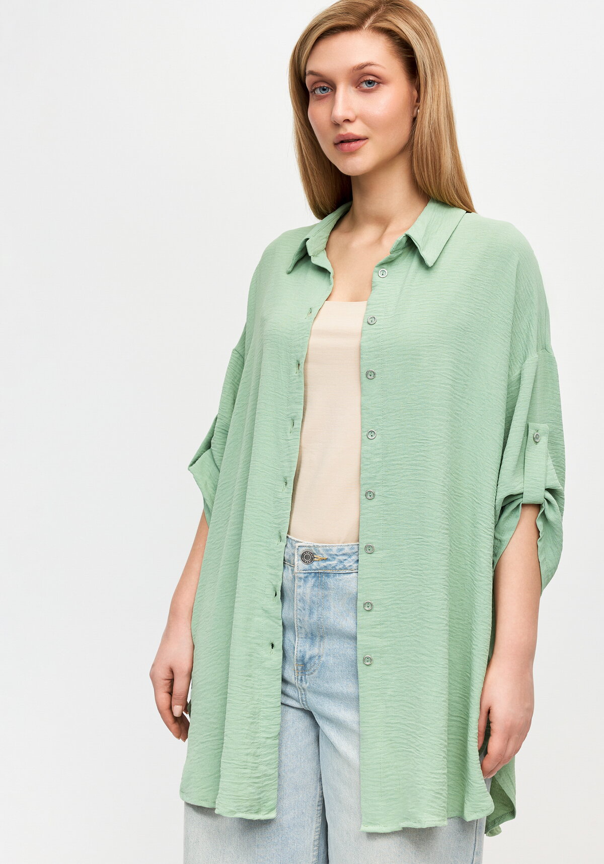 Рубашка свободного кроя имеет удлинённую линию подола. Модель оснащена отложным воротником и рукавами длиной 3/4. Подходит для создания многослойных образов.
