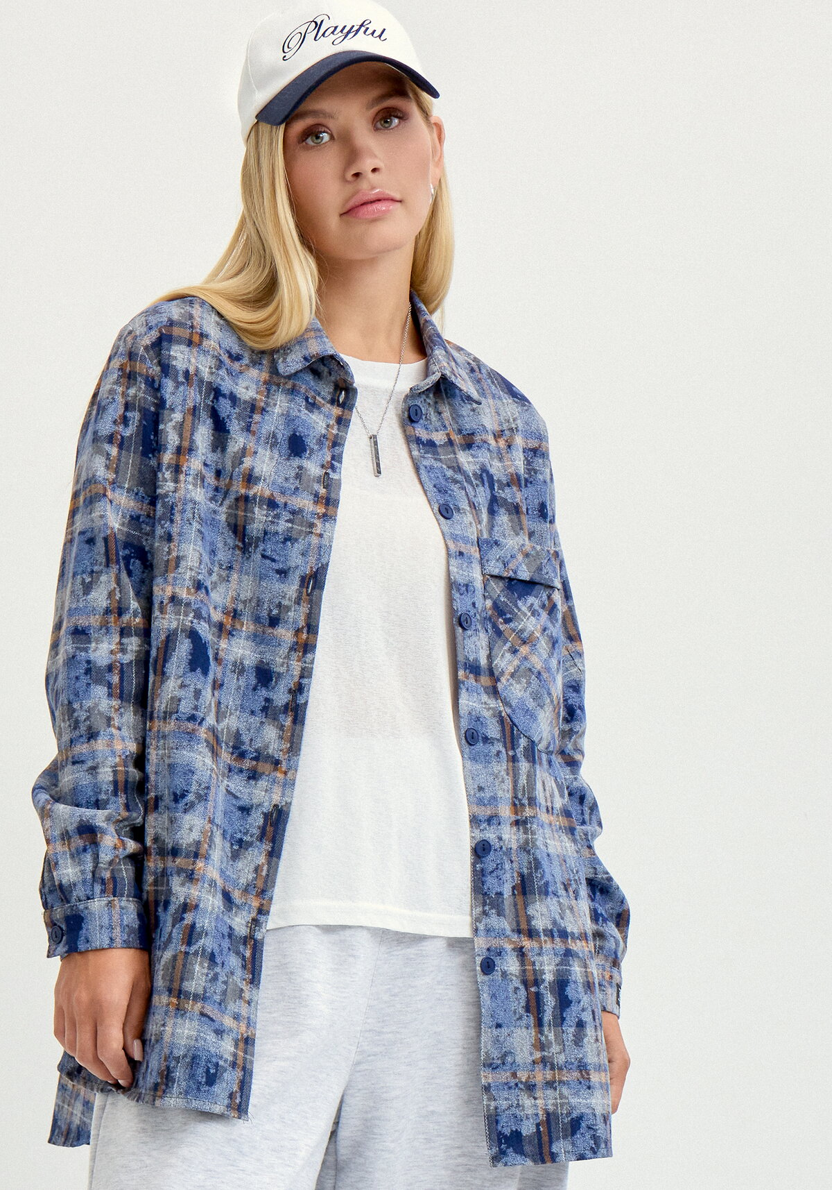 Рубашка свободного покроя с накладным карманом. Воротник рубашечный, низ изделия полукруглый. Застежка на пуговицы.