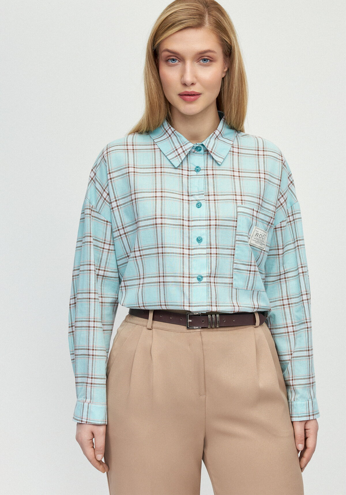 Рубашка на пуговицах выполнена из мягкой хлопковой ткани, имеет свободный крой. Модель оснащена отложным воротником, спущенным плечом и удлинённым рукавом на манжете. На изделии предусмотрен накладной карман с фирменной нашивкой.