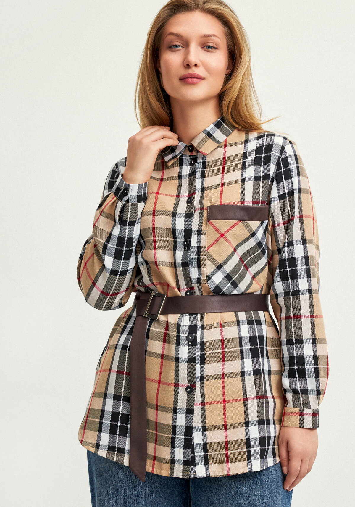 Рубашка свободного покроя, с накладным карманом с отделкой. Пояс более отделочный. Рукав втачной длинный. По боковым швам разрезы. Воротник рубашечный. Застежка на планке на пуговицах.