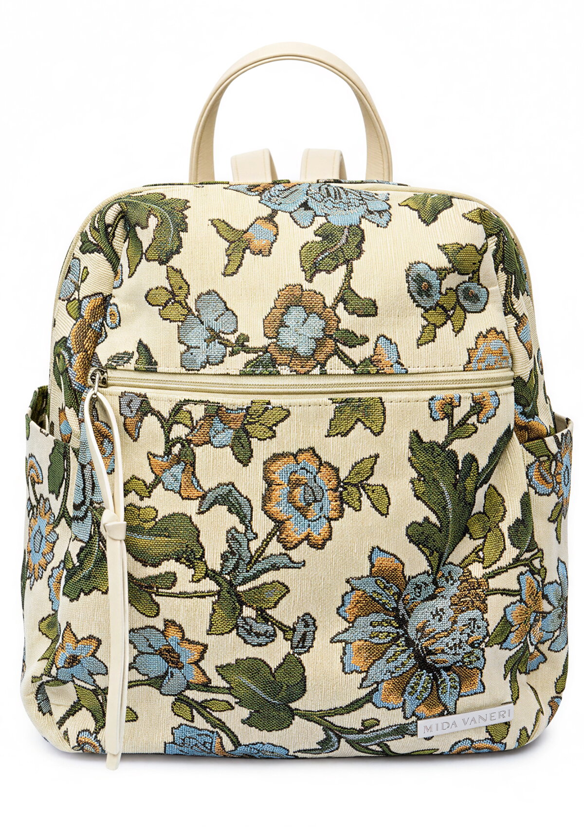 Женский рюкзак выполнен из мягкой гобеленовой ткани, его можно носить в руках или на плече — ремешок регулируется по длине. Модель оснащена карманами на молнии и подходит для прогулок, работы, поездок и путешествий. Несмотря на компактные размеры, рюкзак достаточно вместительный для повседневных вещей, а оригинальный принт дополняет образ.