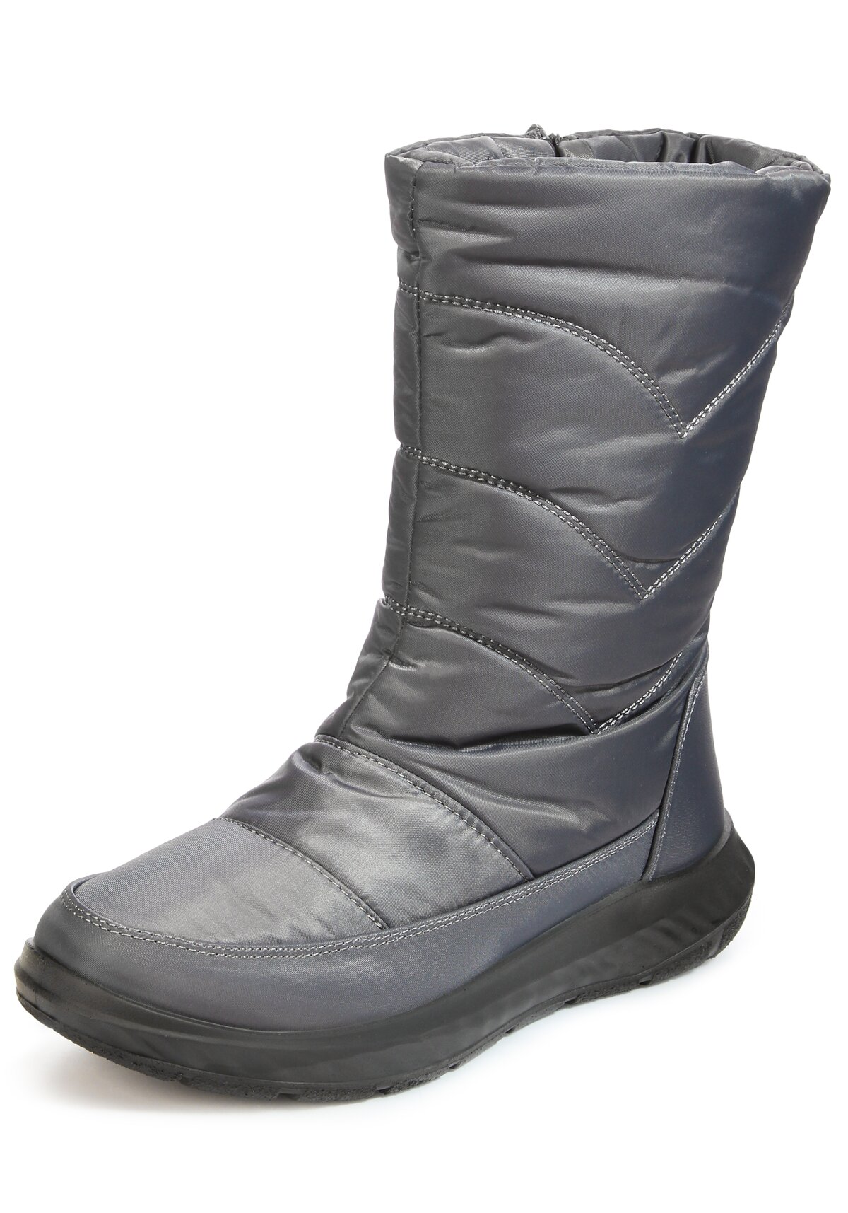 Текстильные сапоги — практичная обувь, в которой вам будет комфортно гулять зимой. Искусственный мех внутри сохраняет тепло, не пропуская холод. Модель представлена в четырех цветах: бордовый, серый, черный, темно-синий.