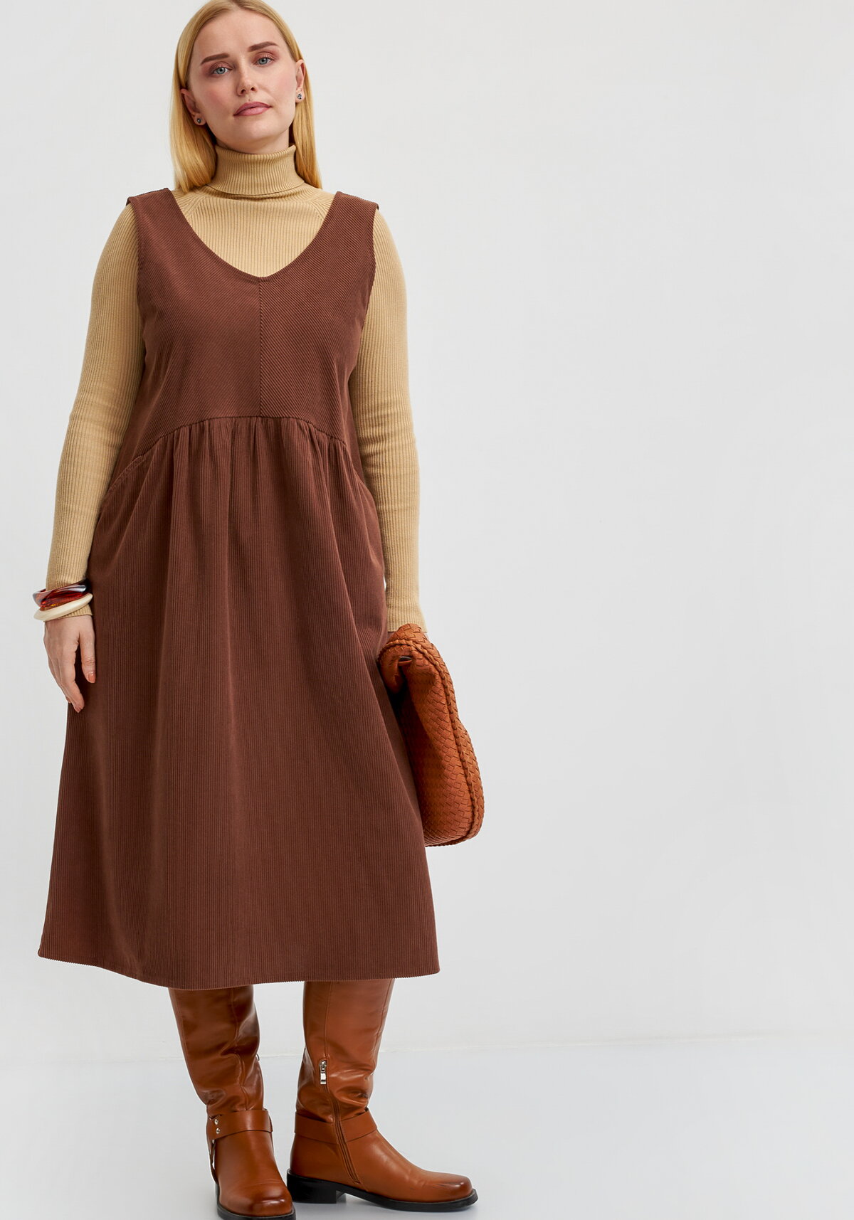 Сарафан вельветовый в стиле бохо идеально подойдёт для любого типа фигуры и возраста. Завышенная линия талии, V-образный вырез, сборки по переду юбки, удобные внутренние карманы. Ткань вельвет.