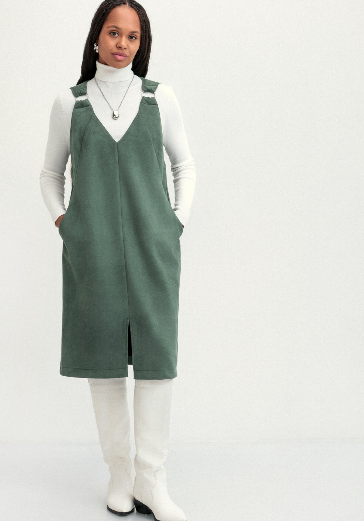Сарафан миди прямого кроя с V-образным вырезом и разрезом спереди. Оснащен боковым карманом и регулируемыми лямками на кольцах.