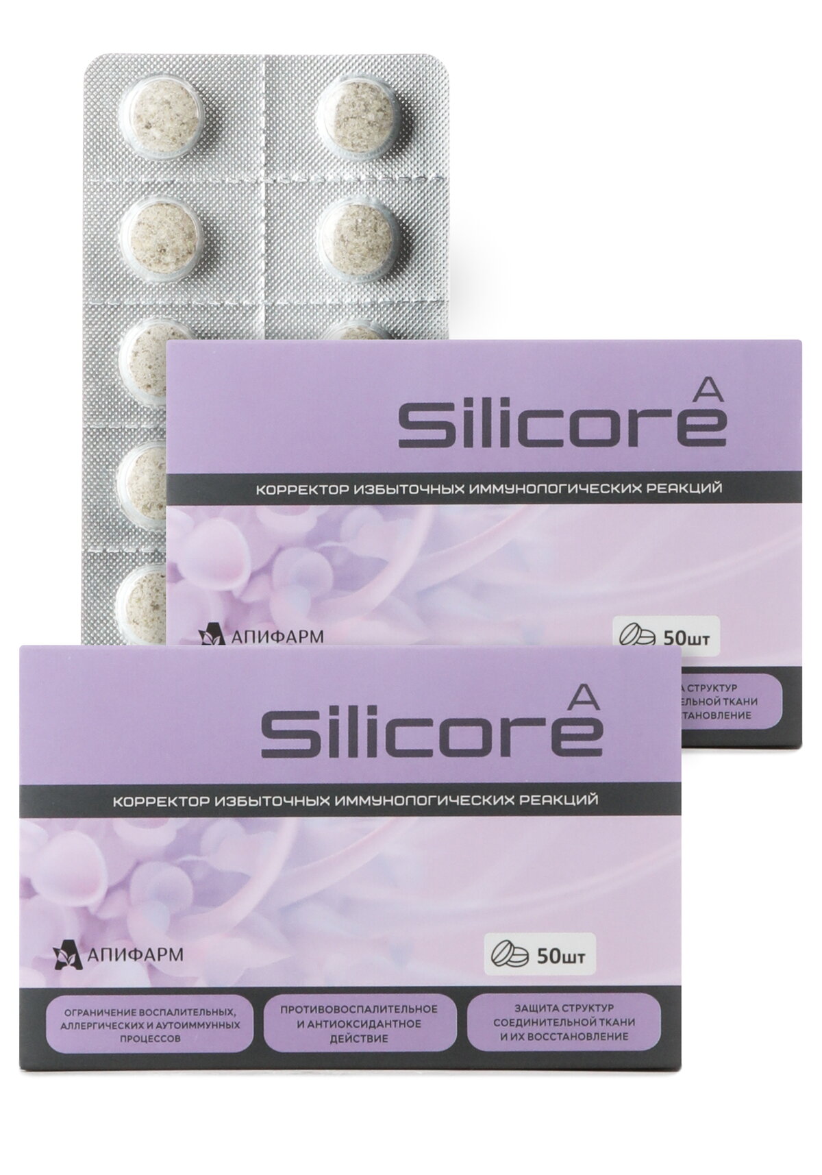 "Силикор А" содержит в составе кремний СиликорТМ, экстракты красного шалфея, фиалки трехцветной, сабельника, шлемника байкальского, гинкго билоба и пижмы. Кроме того, комплекс витаминов А, D, В6, С, никотинамид, магний, цинк, железо, марганец, медь и бор, принимающие участие в обменных процессах в соединительной ткани и участвующих в ее обновлении и регенерации.