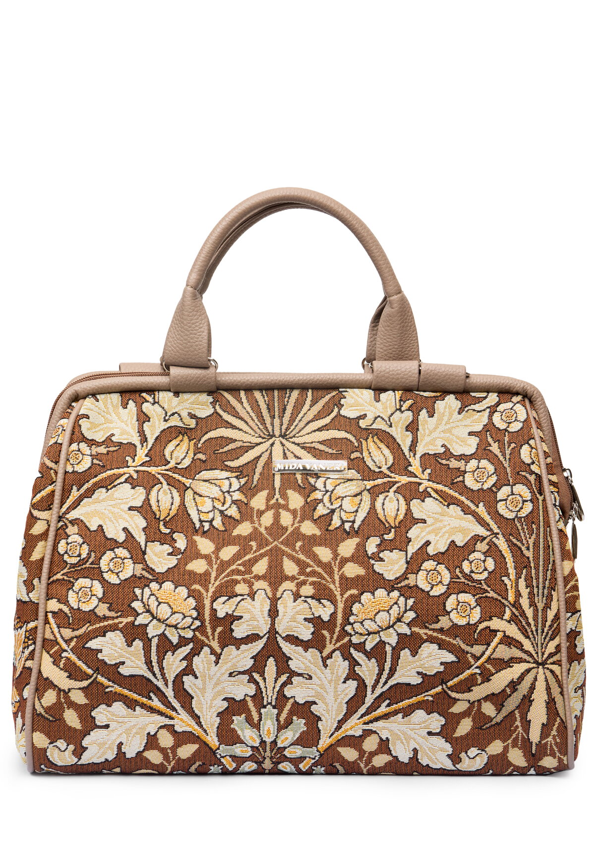Гобеленовая сумка выполнена из хлопкового гобелена российского производства в сочетании с экокожей. Материалы устойчивы к морозу, солнечным лучам и сохраняют первоначальный вид при активной эксплуатации благодаря плотной структуре, многослойному плетению и устойчивым красителям. Модель отличается вместительностью и универсальностью. Вмещает формат А4.
