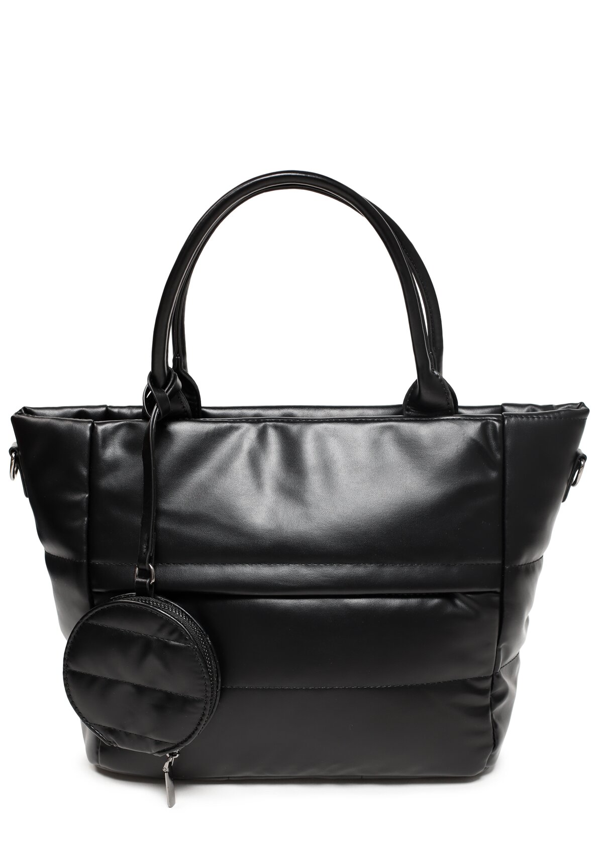 Стильная сумка трапециевидной формы из экокожи. Внутренний карман на молнии. Длинный ремень в комплекте. На сумку крепится миниатюрная круглая сумочка, которую можно использовать в качестве кошелька или косметички. Универсальные расцветки.