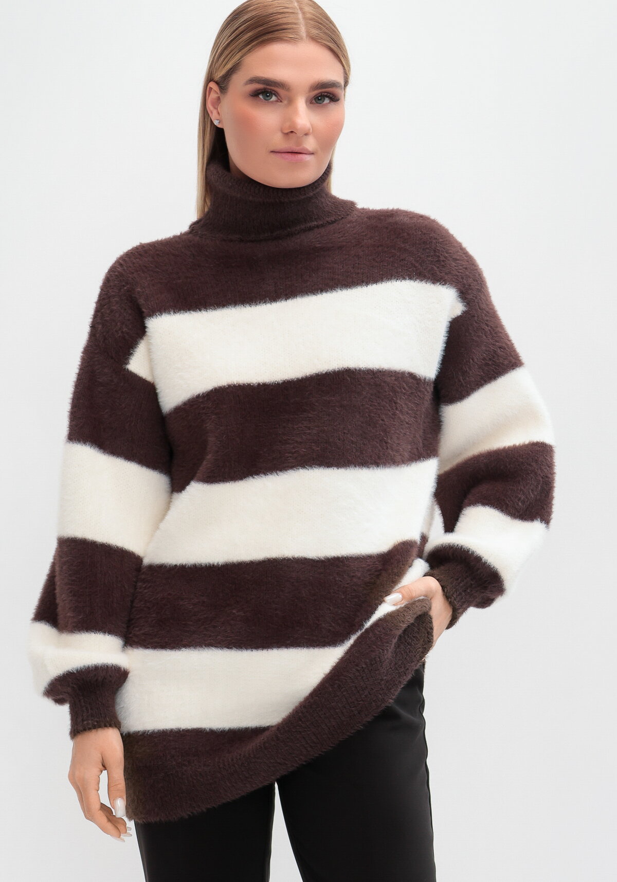 Свитер с шерстью в крупную полоску. Имеет высокое горло и эластичные манжеты.