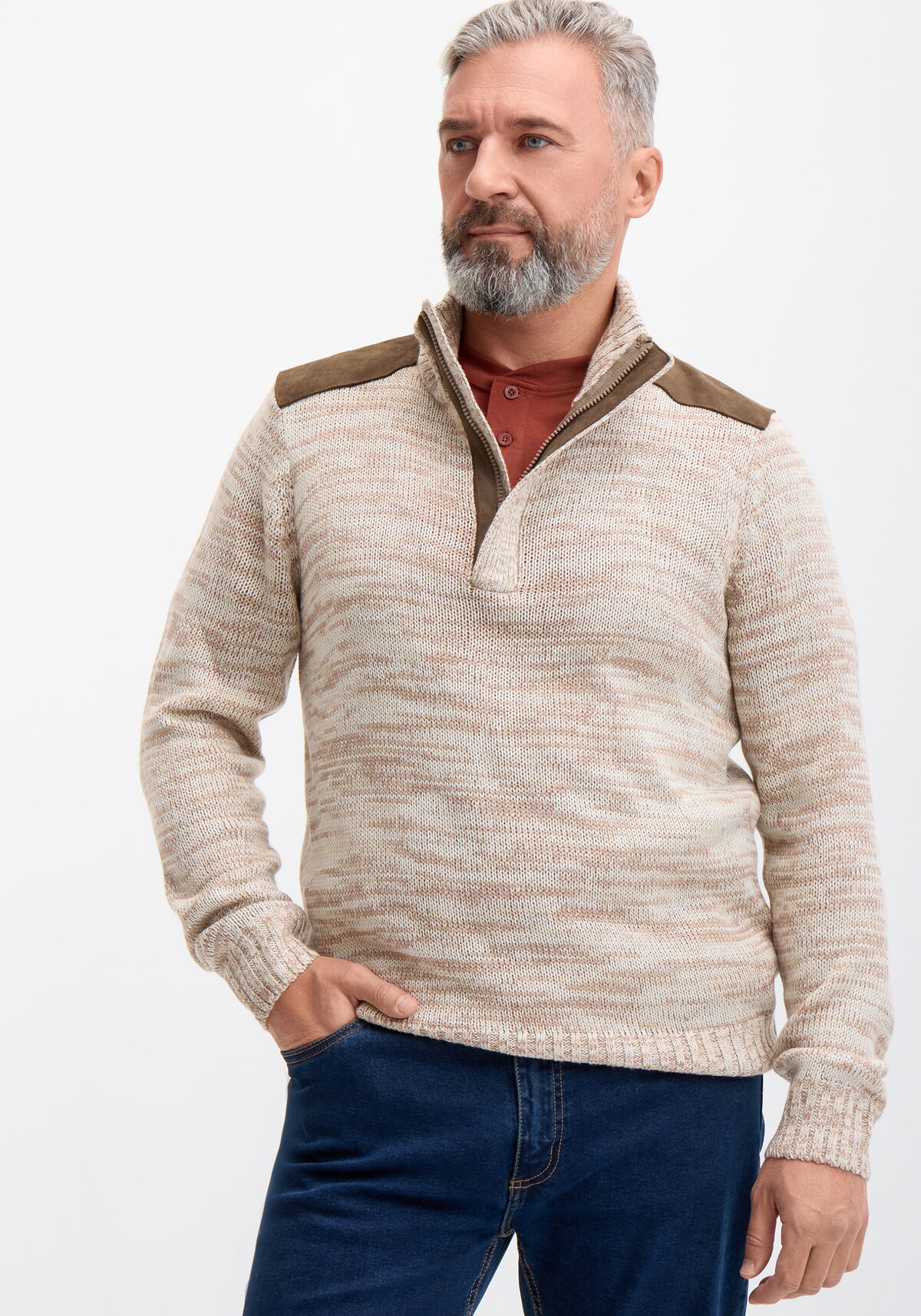 Ощутите естественный комфорт благодаря этому теплому и удобному свитеру с молнией, выполненному из пряжи мулине, которая не требует специального ухода. Отличительные элементы модели: вставки на плечах из однотонного материала с эффектом замши контрастного цвета и планка с застежкой-молнией. Изделие хорошо садится по фигуре благодаря тому, что практичный утолщенный воротник-стойка, манжеты и низ свитера выполнены в виде эластичной резинки 2x2.