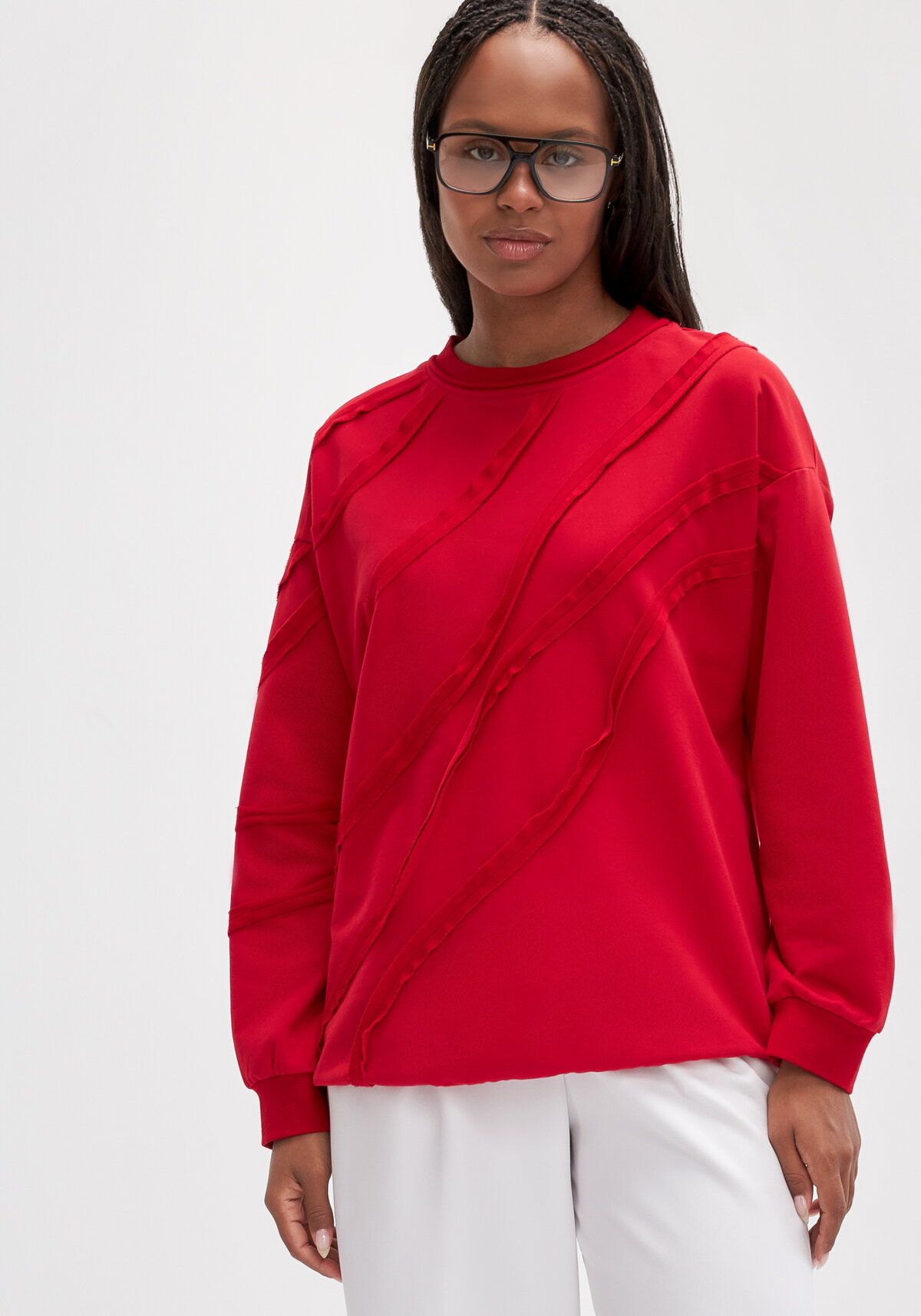 Свитшот с пич-эффектом, на передней полочке декоративный элемент с теснением в виде волн. Спущенный рукав, длина до бедер, резинка по низу рукава и низу изделия.