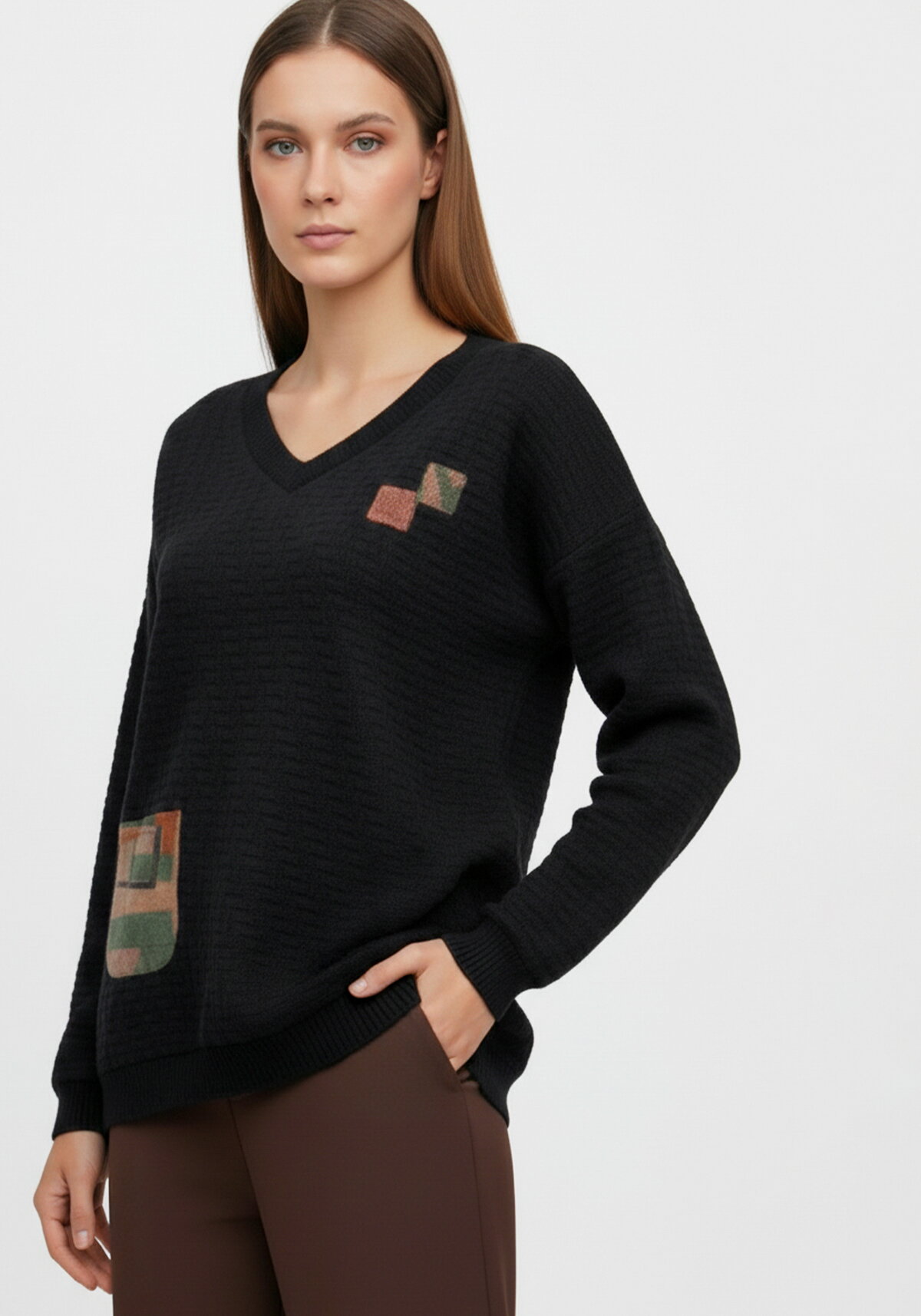 Свитшот выполнен из фактурного трикотажа и имеет свободный крой. Модель оснащена V‑образным вырезом, накладным карманом спереди. На изделии присутствует вышивка.