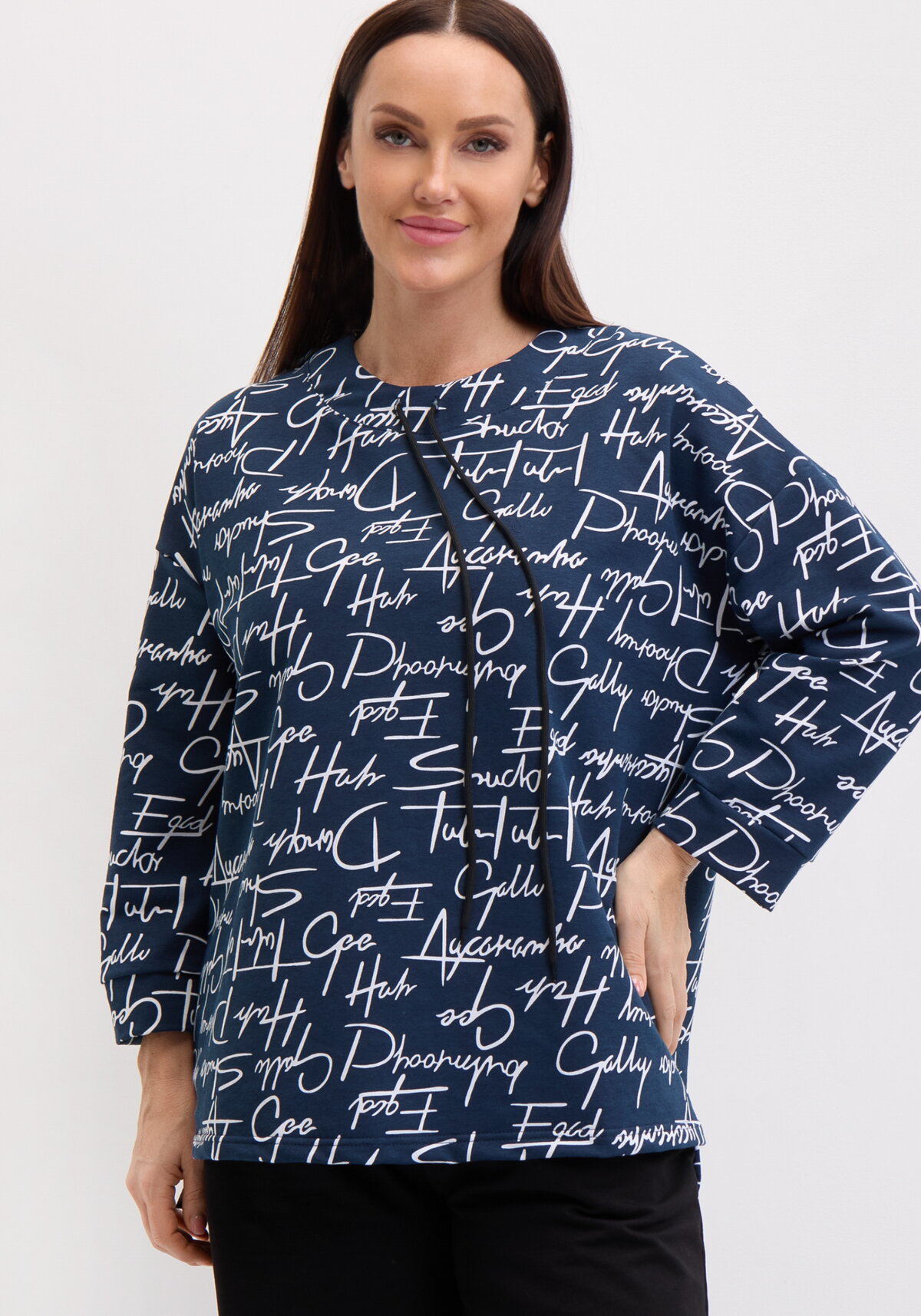 Свитшот трикотажный из футера с набивным рисунком. Модель свободного силуэта с удлиненной спинкой и разрезами по боковым швам. Круглый вырез горловины обработан обтачкой с кулиской. Плечо спущенное, рукав длиной 7/8.