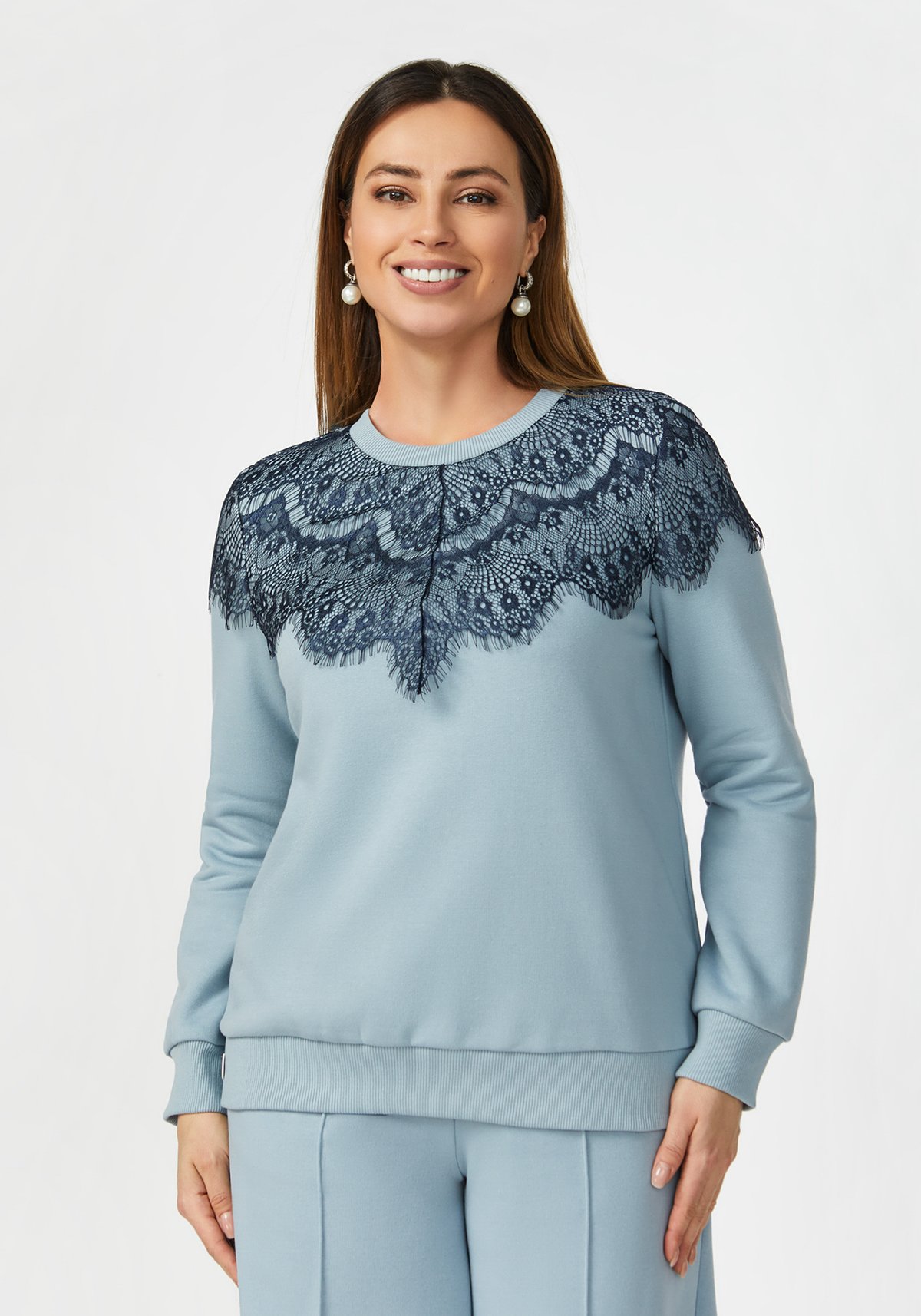Приятный к телу хлопковый свитшот с оригинальной кружевной отделкой. Отличный повседневный вариант — сочетается с любым низом. Комфортный свободный крой. Пастельные тона. Хорошо садится по фигуре и не сковывает движений.