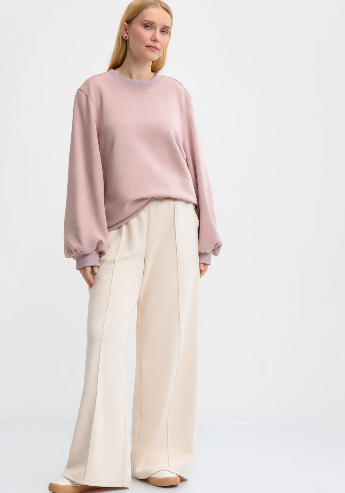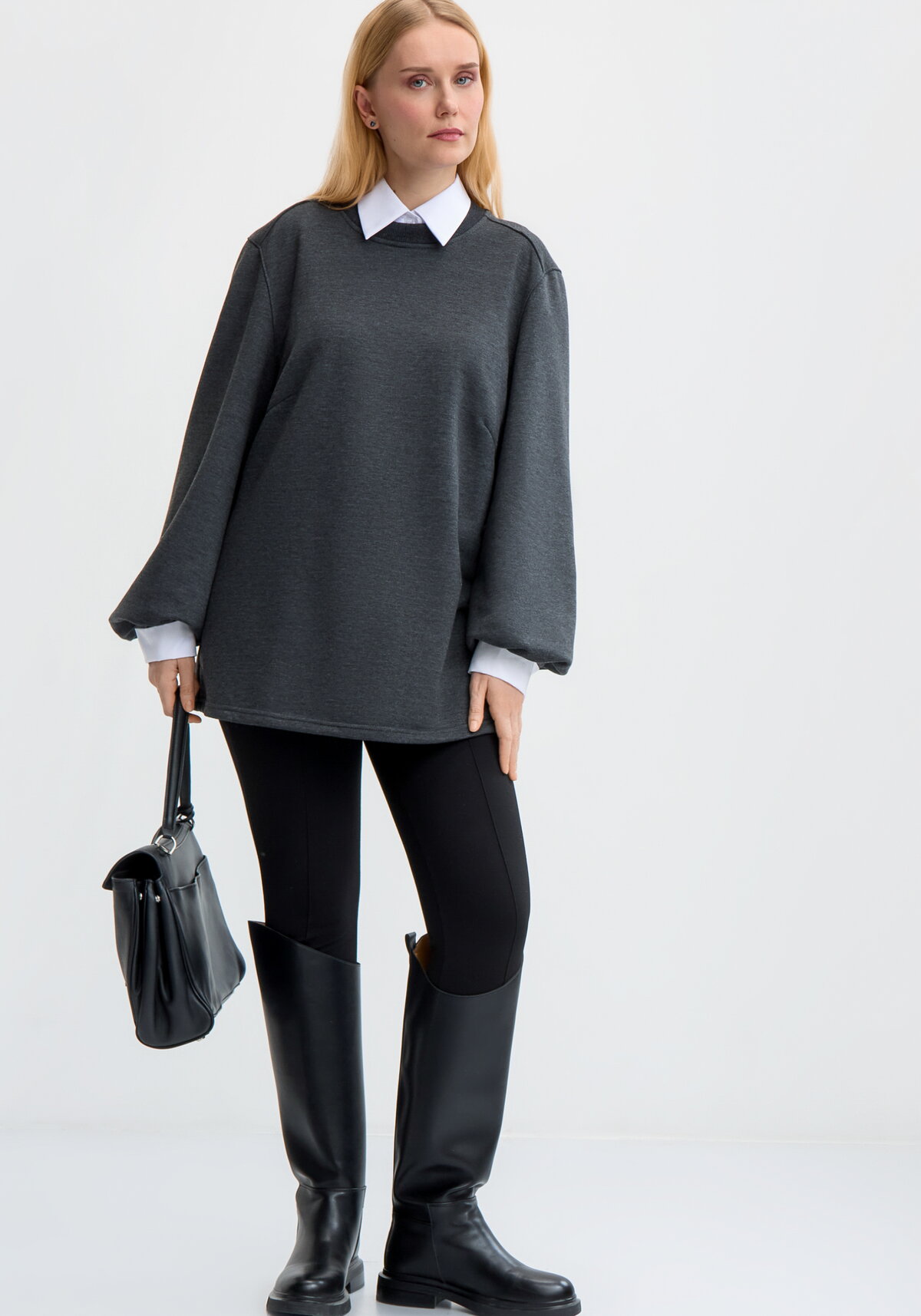 Лонгслив приталенного силуэта до середины бедра отличается продуманной конструкцией. Круглый вырез горловины оформлен притачной бейкой с отстроченным швом. Спинка дополнена средним швом и кокеткой, а на полочке выполнены нагрудные вытачки от боковых швов и цельнокроеная кокетка. Длинные втачные рукава имеют одношовную конструкцию, их низ собран в аккуратную сборку и обработан притачной манжетой.