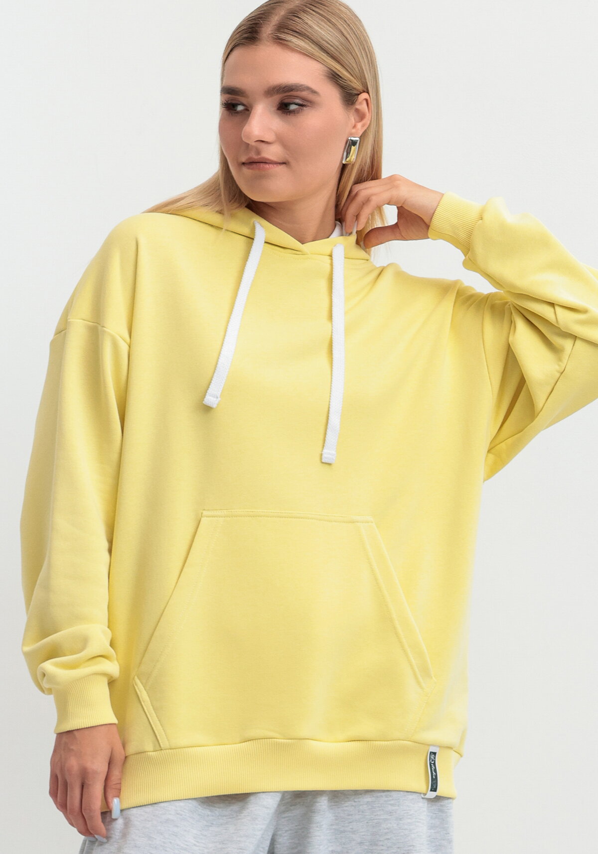Толстовка из трикотажного полотна свободного силуэта. Манжеты рукавов и низ с эластичной резинкой. В капюшоне подкладка из кулирной глади контрастного цвета. Удобный накладной карман-кенгуру. Модель представлена в трех цветах: голубой, желтый, сиреневый.