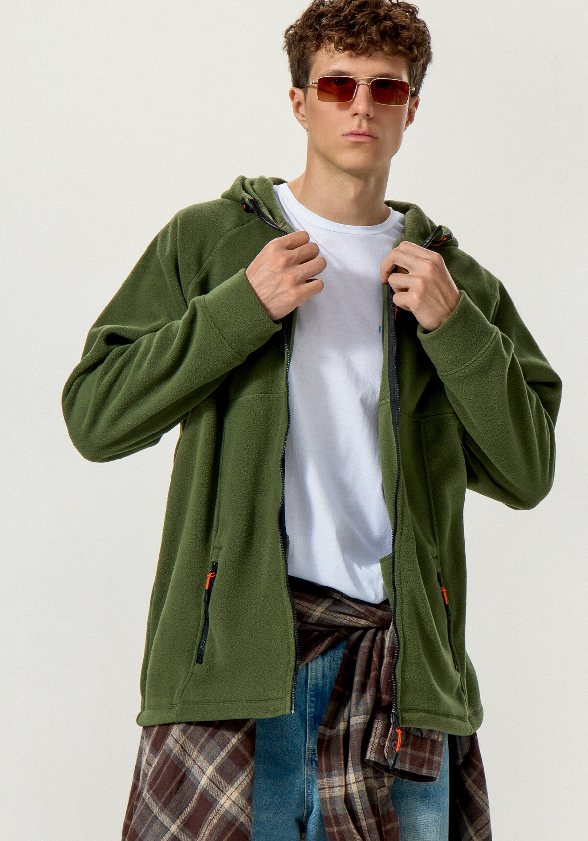 Толстовка из флиса свободного кроя. Толстовка на молнии, капюшон с цельнокроеной стойкой на кулиске. Два вертикальных кармана на молнии удобно располагаются в зоне пояса.
