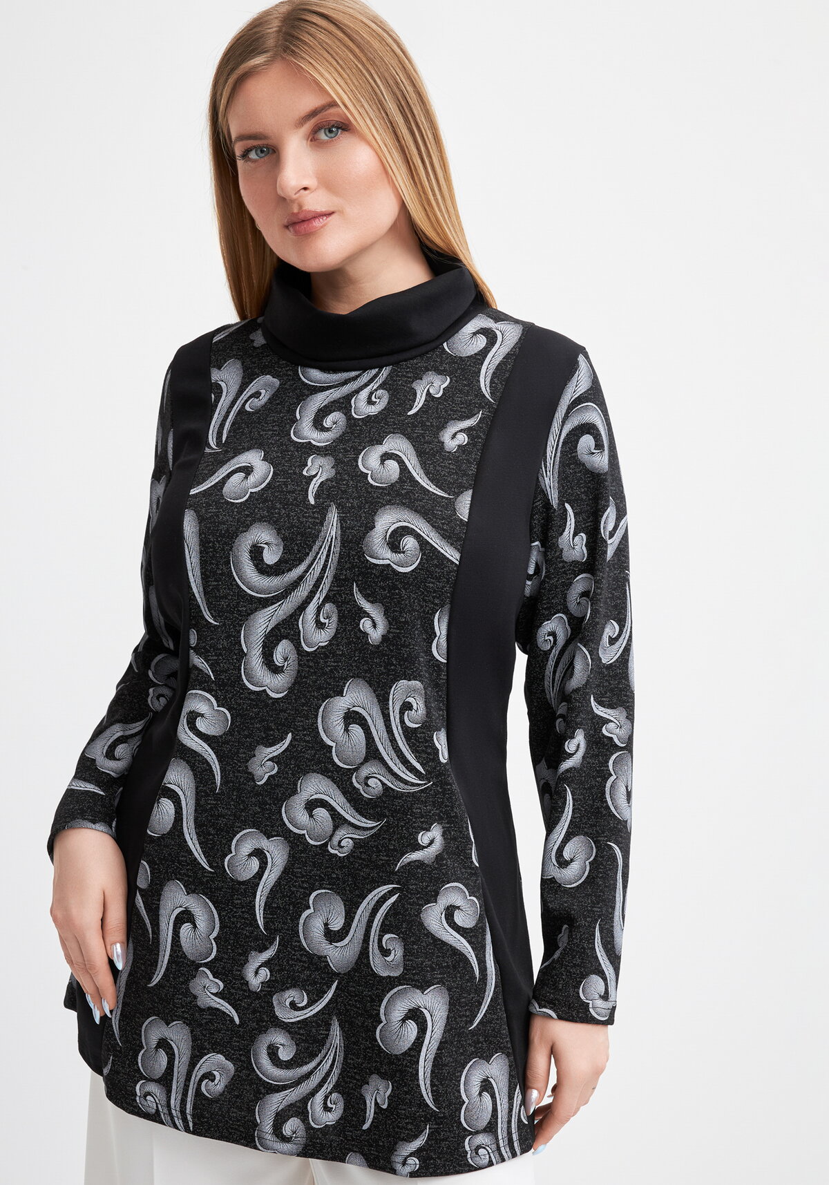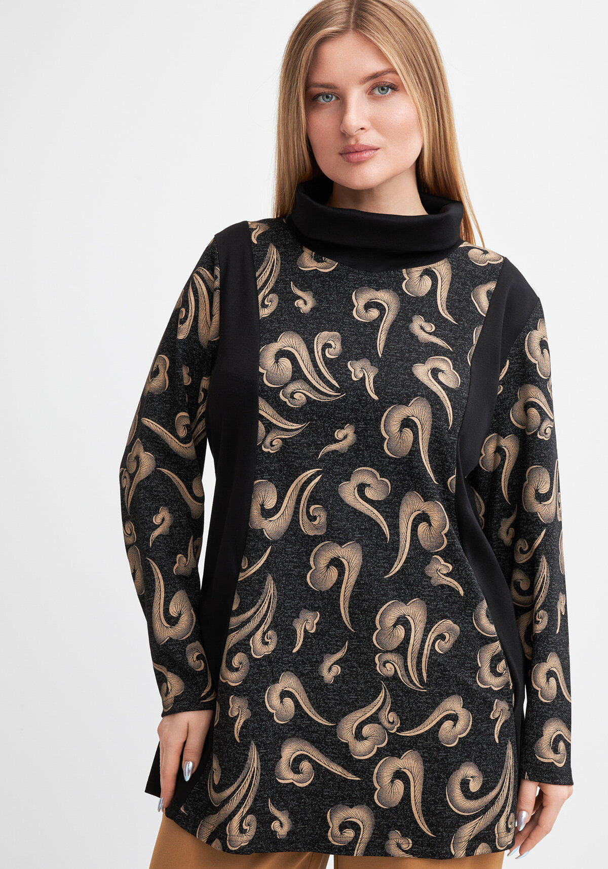 Туника с длинным рукавом и высоким воротом. Практичные прорезные карманы органично вписаны в крой. Контрастные вставки придают модели выразительность и современный акцент.