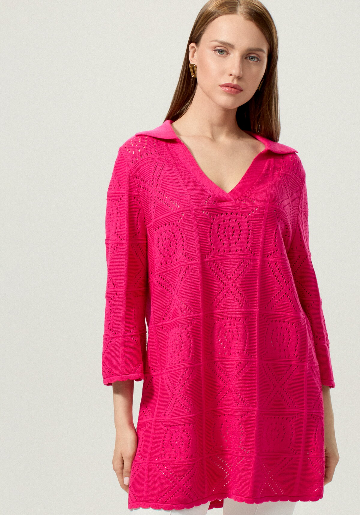 Элегантная туника выполнена в технике ажура, из натурального органического хлопка с пан-волокном. Приятная к телу. V-образный отложной воротник. Широкий размерный ряд.