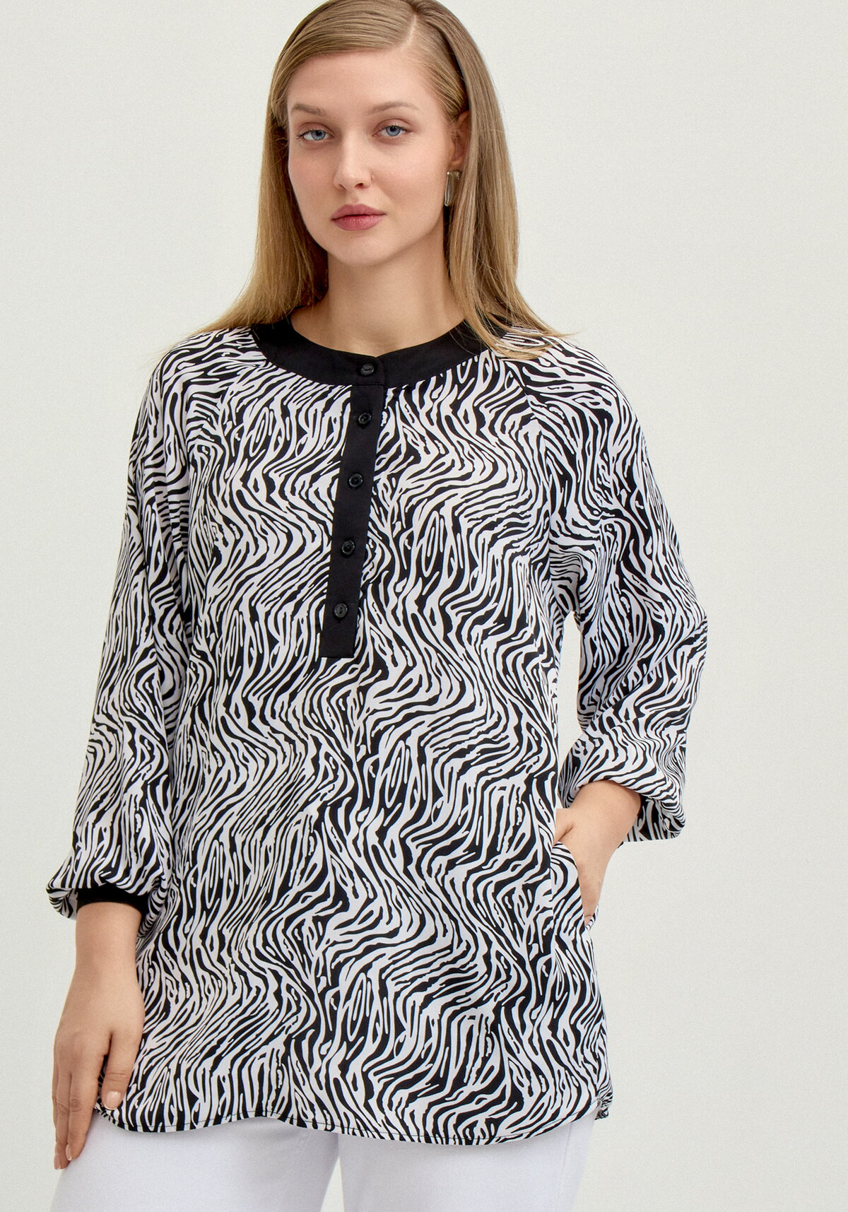 Туника с воротом-стойка на пуговицах. Имеет длинный рукав и пояc на талии.