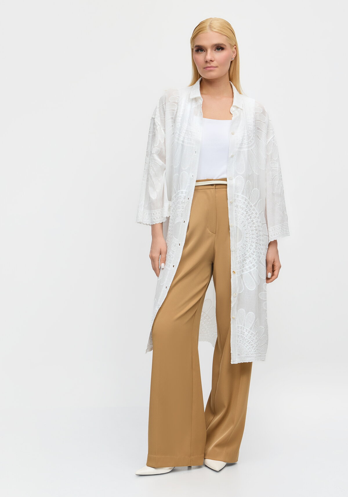 Изящная туника с утончённой вышивкой из 100% хлопка подарит вам непревзойдённый комфорт и ощущение натуральности на протяжении всего дня. Отложной воротник и застёжка на пуговицы придают модели классический шарм, деликатно подчёркивая женственность образа, а рукав 7/8 делает эту вещь особенно универсальной — она гармонично сочетается как с лёгкими юбками, так и с джинсами, позволяя создавать элегантные повседневные луки с минимальными усилиями.