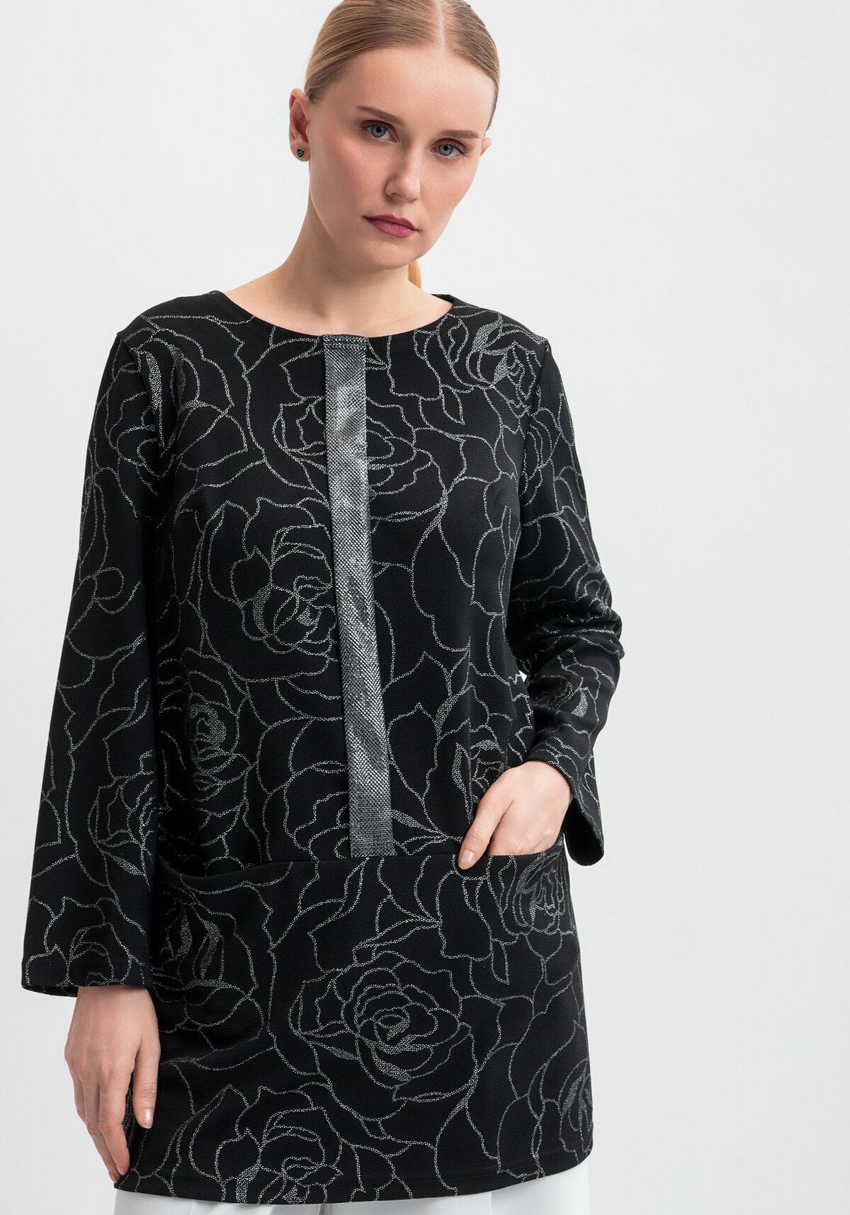 Туника из фактурного трикотажа с узором из роз. Модель с длинным рукавом, удобными карманами и блестящей вставкой по центру переда. Вертикальная вставка украшает и зрительно стройнит фигуру.