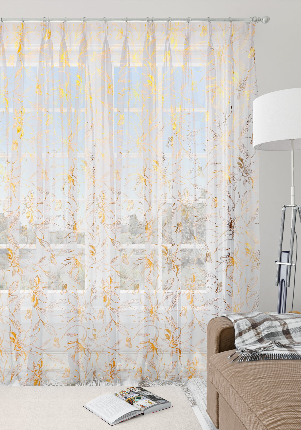 Легкое, полупрозрачное полотно с серебряным и золотым блеском создаст уютную атмосферу в вашем доме. Ширина тюля составляет 2 метра. Шторная лента шириной 4 см обеспечивает быстрое и удобное крепление тюля. Занавеска идеально подходит для использования в любой комнате - в гостиной, спальне, кухне или детской. Придает помещению нежность и легкость, а также создает приятную фильтрацию света, позволяя сохранить комфортную атмосферу внутри. Благодаря возможности машинной или ручной стирки, тюль очень легко поддерживать в чистоте и сохранять его привлекательный внешний вид на протяжении длительного времени.