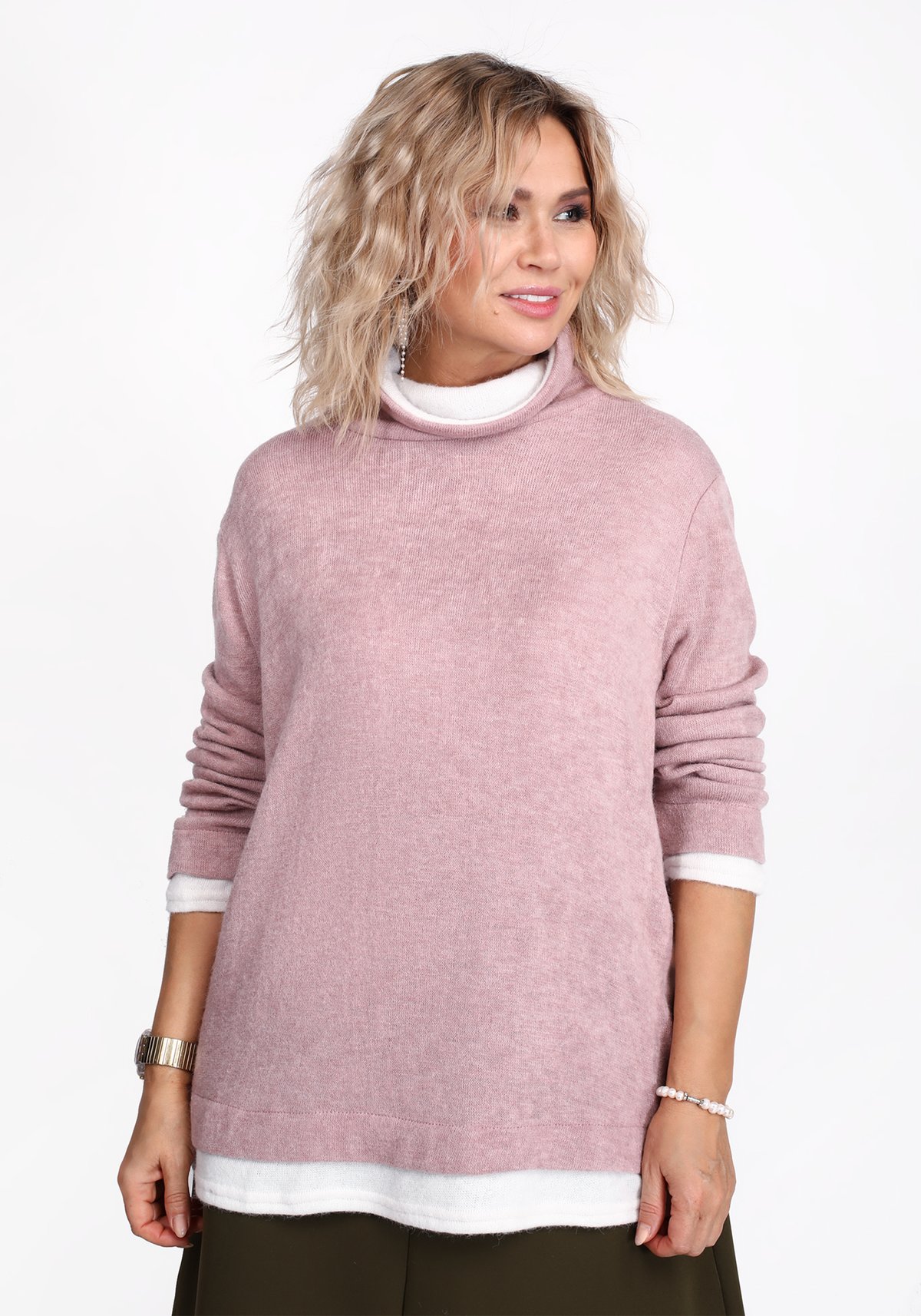 Мягкая теплая водолазка из двух видов ткани — она обязательно станет любимой вещью в вашем гардеробе. Свободный крой. Натуральный материал.