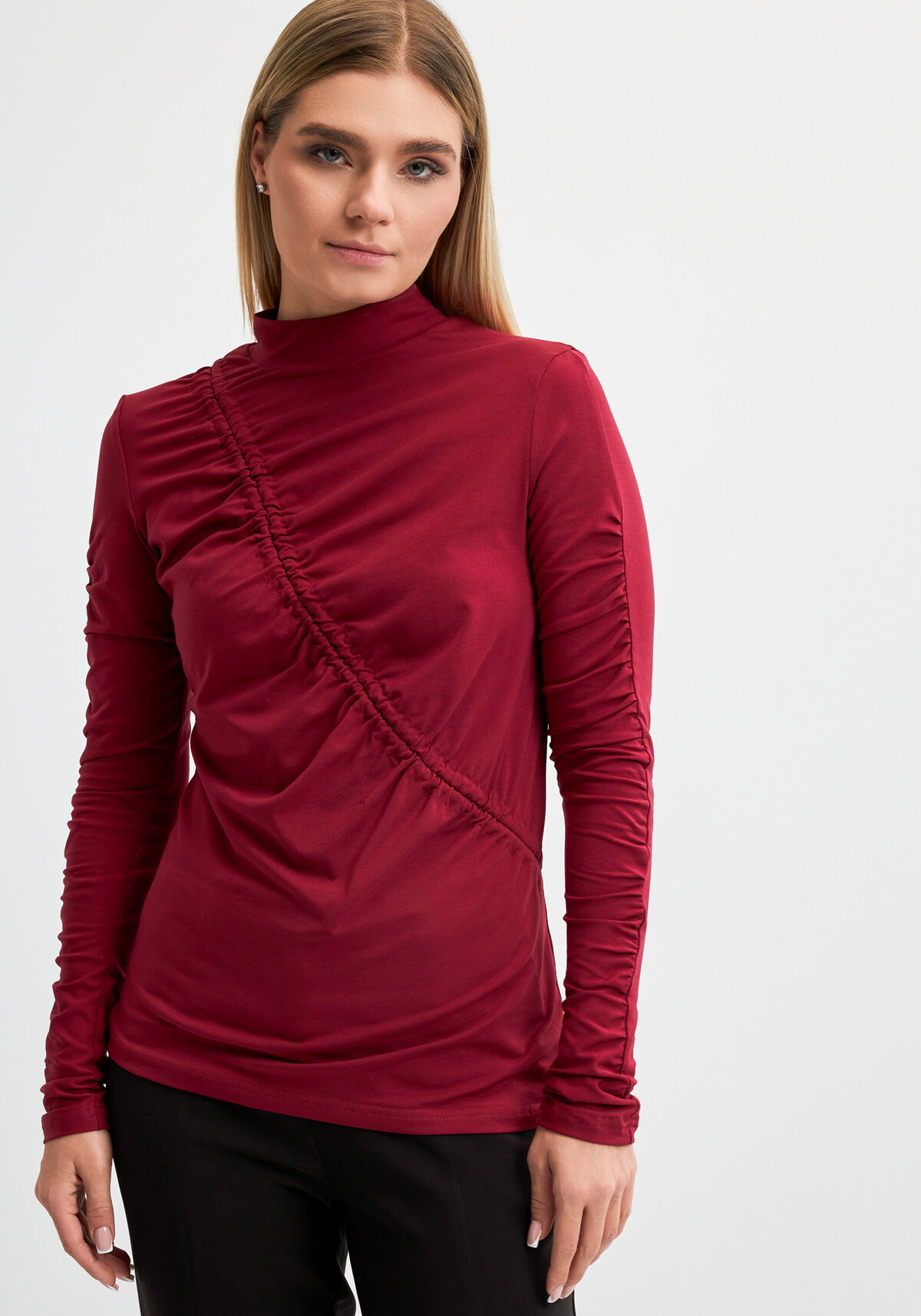 Водолазка прилегающего силуэта, длиной выше линии бедра. Кулиска, расположена на полочке, выходит из левого плечевого шва и уходит в правый боковой шов. В кулисе вставлен шнур и закреплен в швах, образовывая равномерную сборку по полочке. Воротник-стойка, рукав втачной двушовный. По верхнему рукаву шва — сборка.