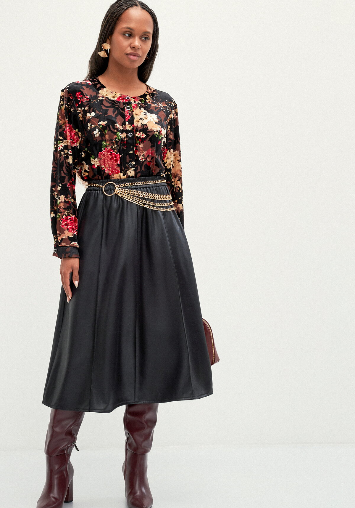 Трикотажная юбка А-образного силуэта. Пояс на резинке обеспечивает идеальную посадку.