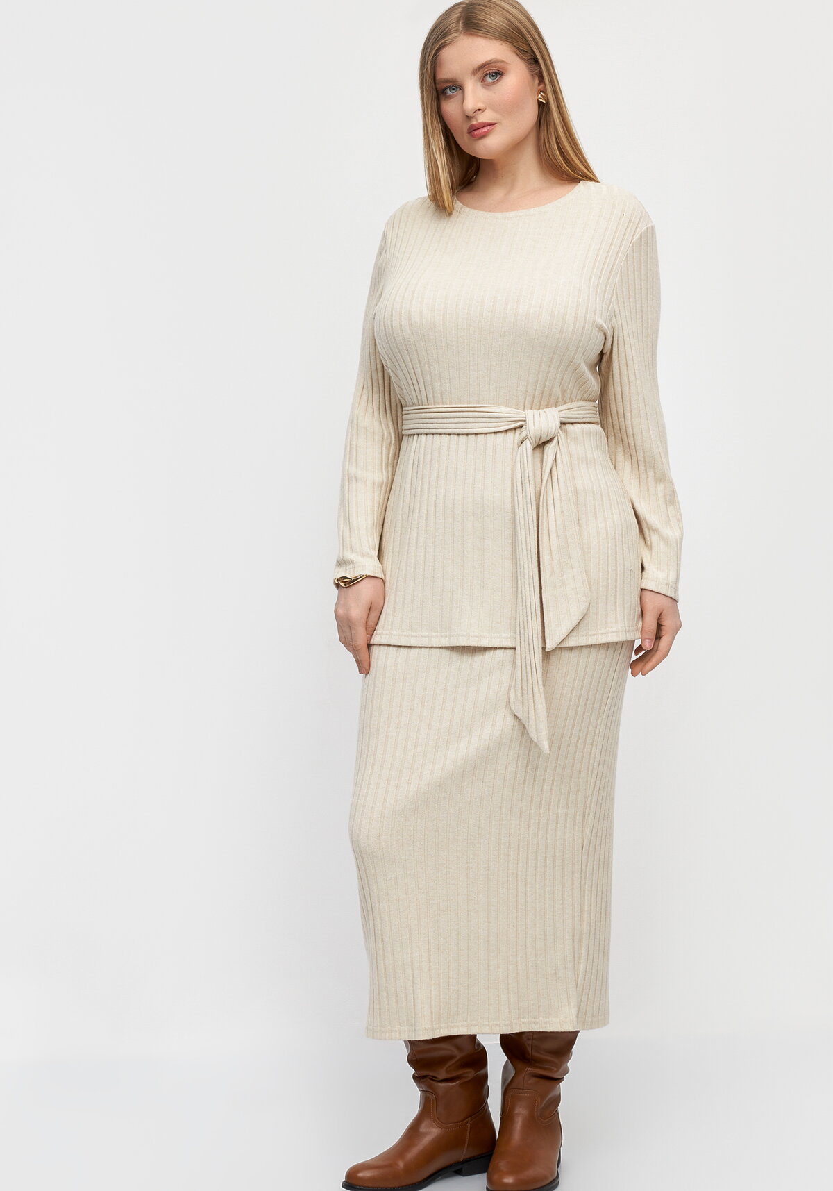 Юбка выполнена из вязаного полотна «лапша», состоит из двух полотнищ. Модель имеет длину миди. Пояс цельнокроеный, оснащен эластичной лентой.