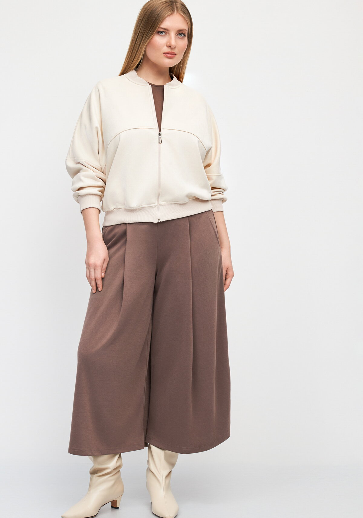 Юбка-брюки имеет складку на передней части, выполненную из-под двойной дублированной кокетки. По задней части талии предусмотрена эластичная резинка. Модель обеспечивает комфортную посадку и свободу движений.