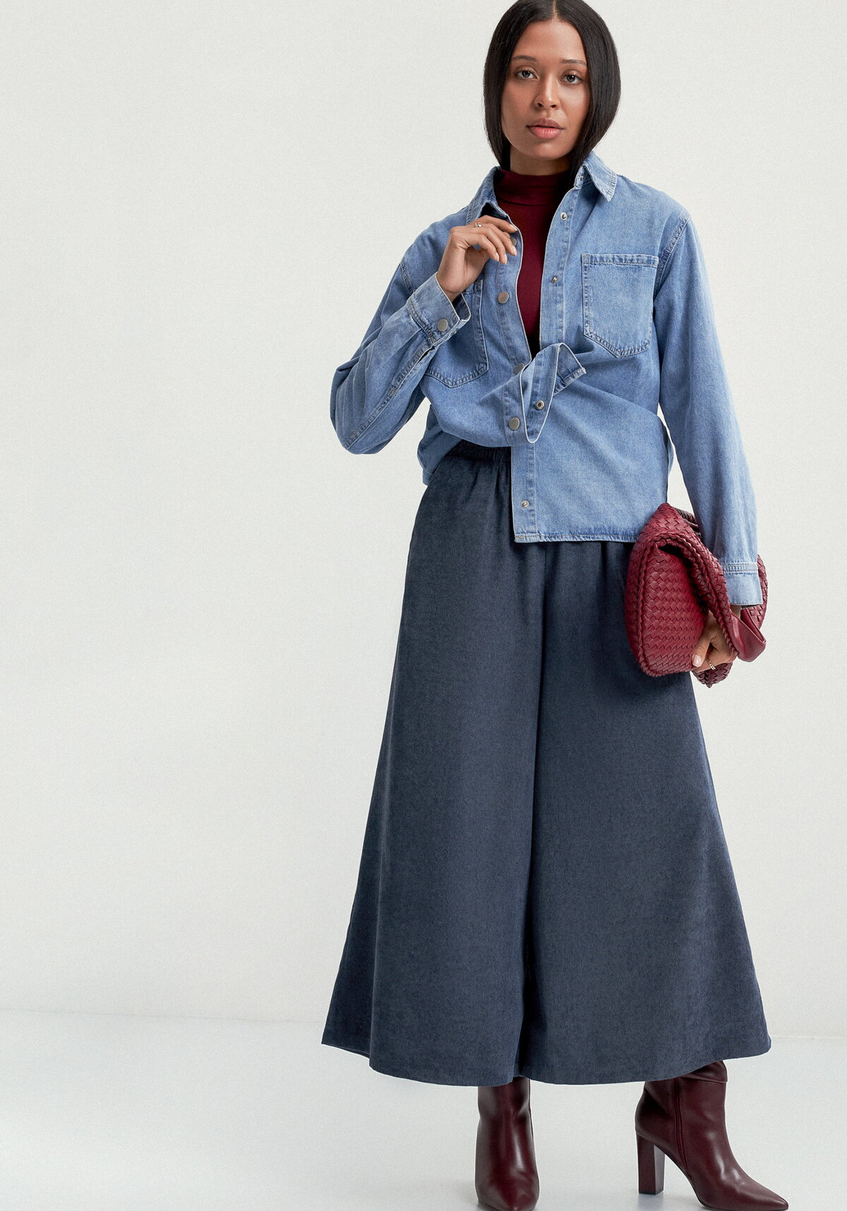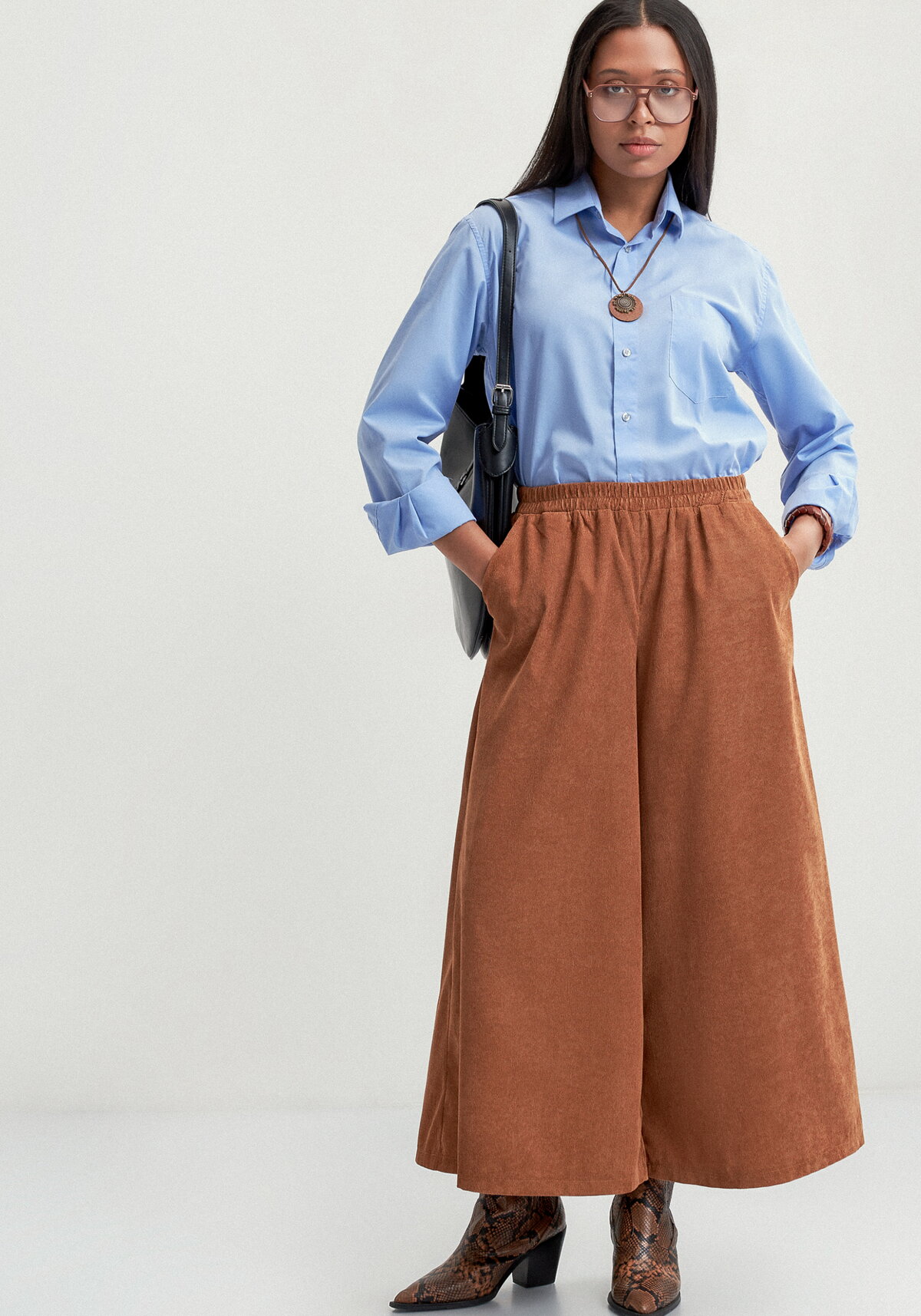 Юбка-брюки прямые широкие длиной до середины икры. Пояс на резинке. Впереди косые карманы.