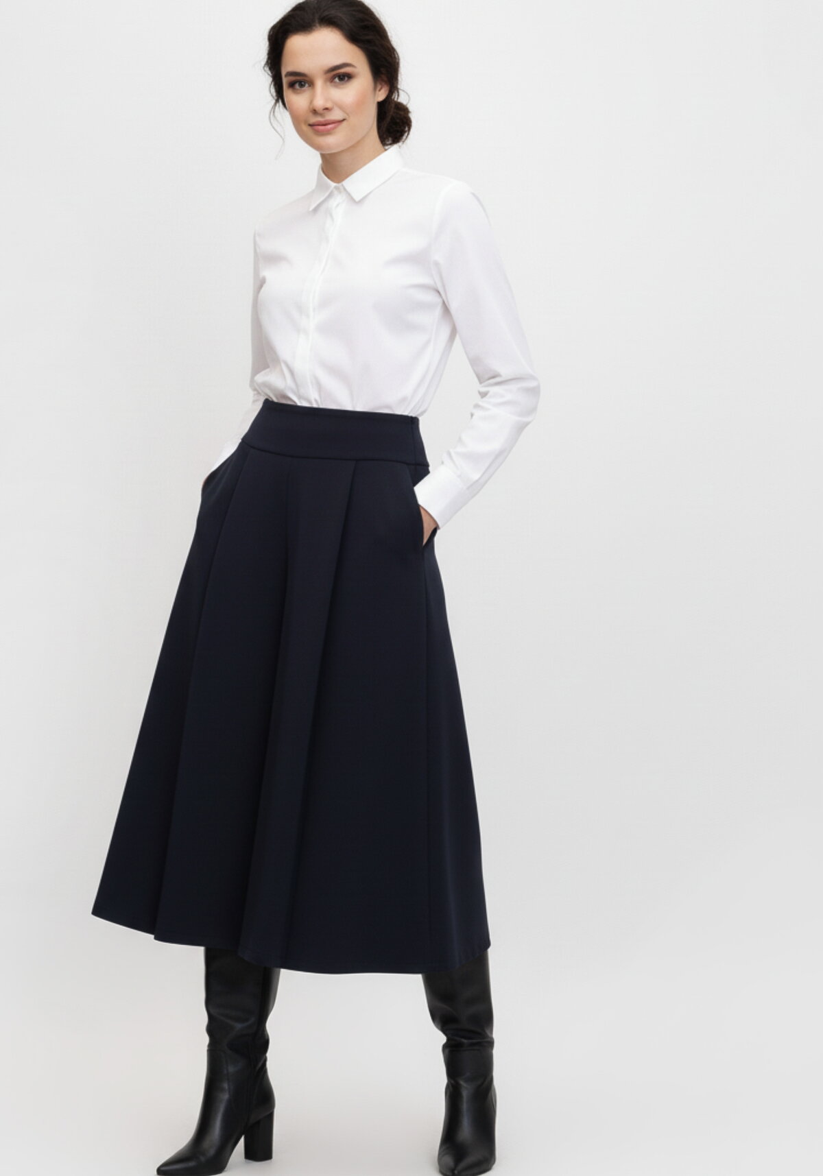 Стильная юбка-брюки — изысканное решение для создания элегантного образа. Оригинальная конструкция с декоративной складкой на передней части, выполненной из двойной дублированной кокетки, придает модели особый шарм и утонченность. Комфортная эластичная вставка по задней части талии обеспечивает идеальную посадку и свободу движений.