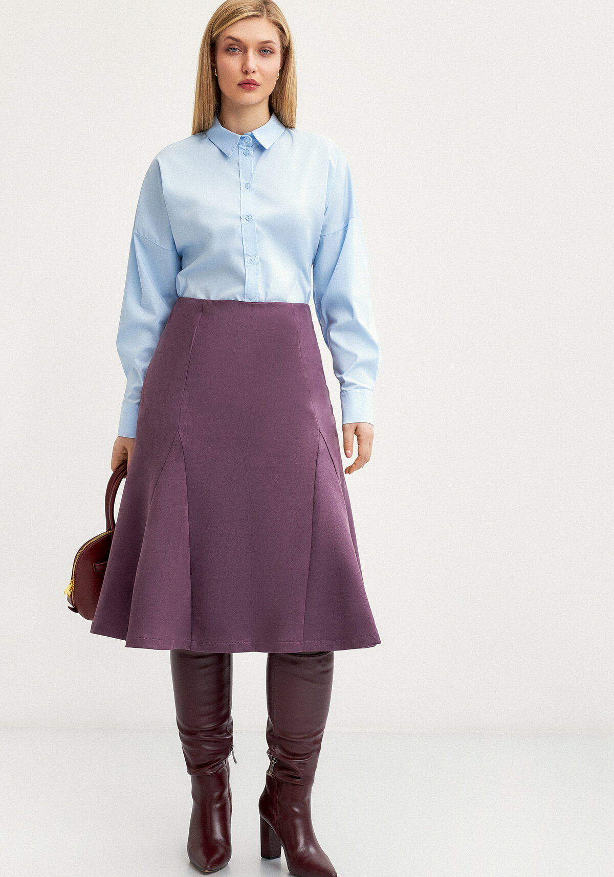 Юбка "годе" подчеркивает фигуру благодаря полуприлегающему силуэту и изящно расширяющимся от бедра клиньям. Изделие выполнено на обтачке с резинкой, что обеспечивает комфортную посадку по талии без лишних поясных элементов. Лаконичный крой и продуманная конструкция создают элегантный образ, сочетающий в себе женственность и удобство.