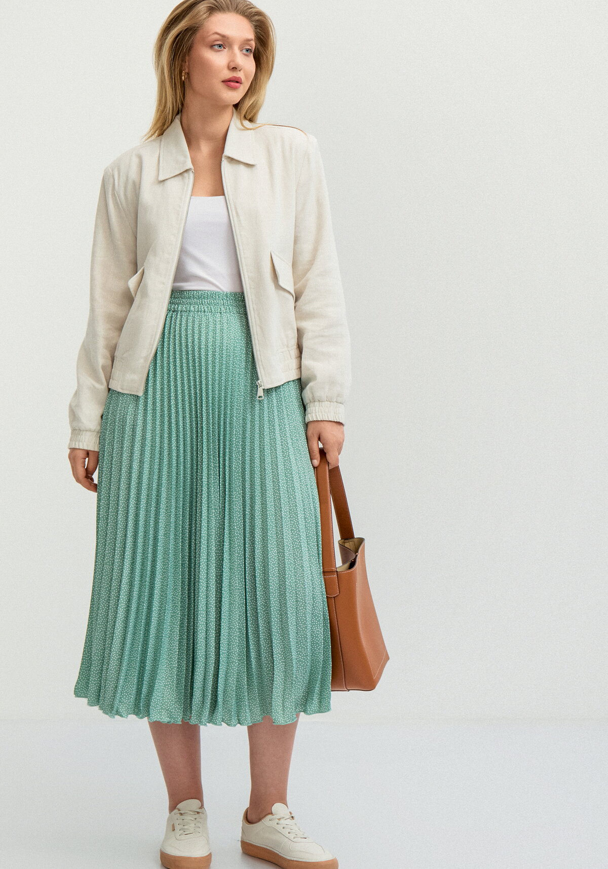 Юбка-гофре из принтованной ткани. Пояс на резинке. Длина миди. Модель представлена в трех цветах: кофейный, мятный, голубой.