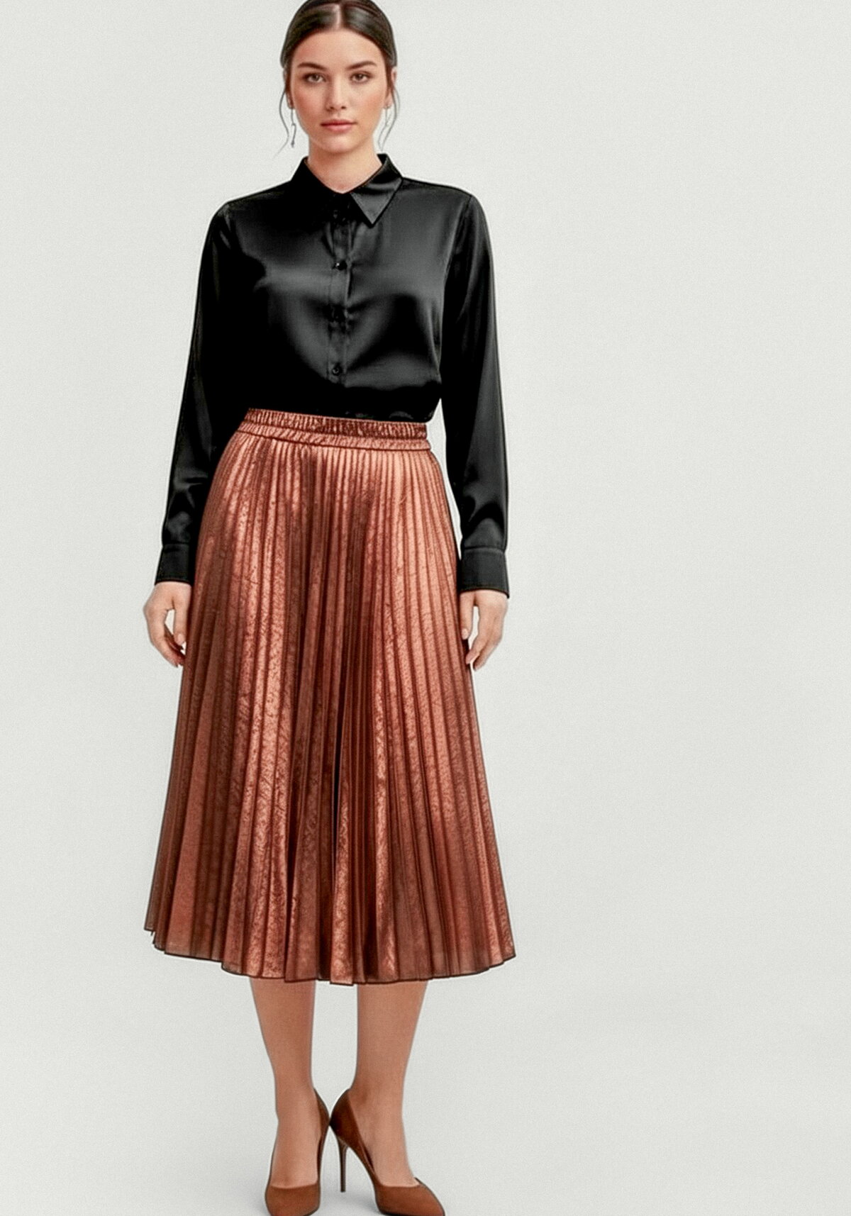 Юбка гофре с блестящим напылением выполнена из трикотажного полотна. Модель имеет пояс на резинке. Изделие дополнено подкладкой.