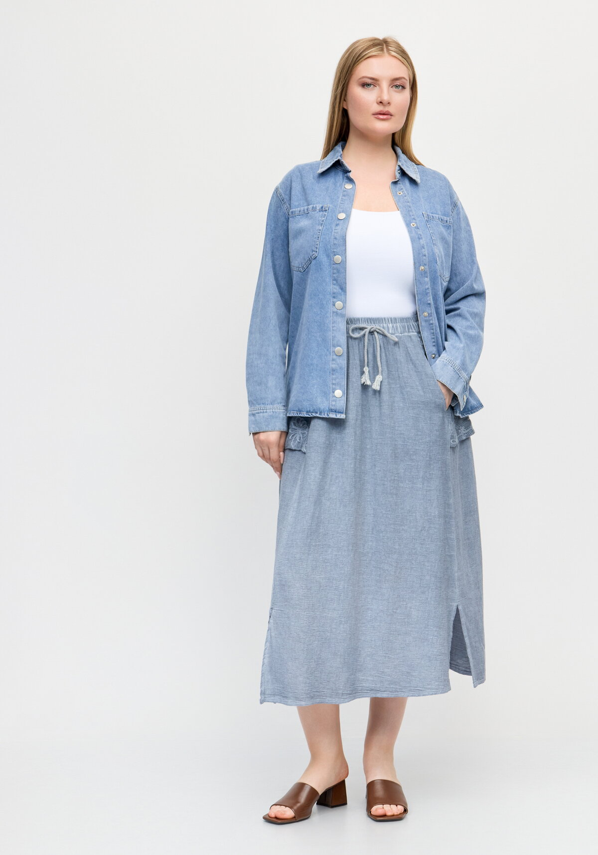 Элегантная прямая юбка свободного кроя на подкладке подарит вам ощущение лёгкости и комфорта, позволяя создавать стильные образы на каждый день. Удобный пояс на резинке с кулиской обеспечивает идеальную посадку и не сковывает движений — вы будете чувствовать себя свободно в любой ситуации. Рельефы с разрезами по нижнему краю спереди изящно обыгрывают силуэт, добавляют модели динамики и деликатно подчёркивают походку. Накладные карманы из кружевной ткани‑компаньона не только функциональны, но и служат изысканным декоративным акцентом, придавая юбке утончённый женственный шарм. Сочетайте эту модель с любимыми блузами или топами — и пусть ваш образ будет воплощением гармонии стиля, комфорта и безупречного вкуса!