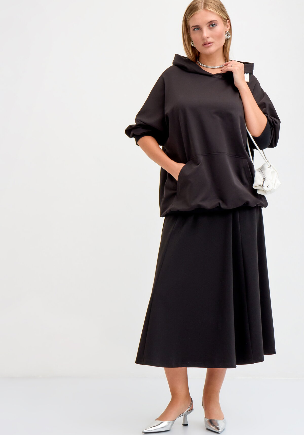 Юбка А-силуэта. Длина миди. Пояс на резинке. Без карманов. Модель представлена в двух цветах: черный и темно-синий.